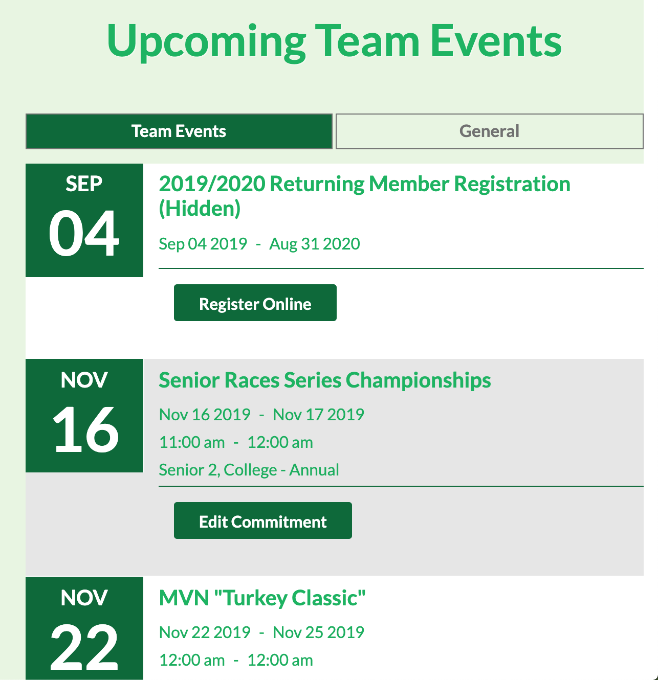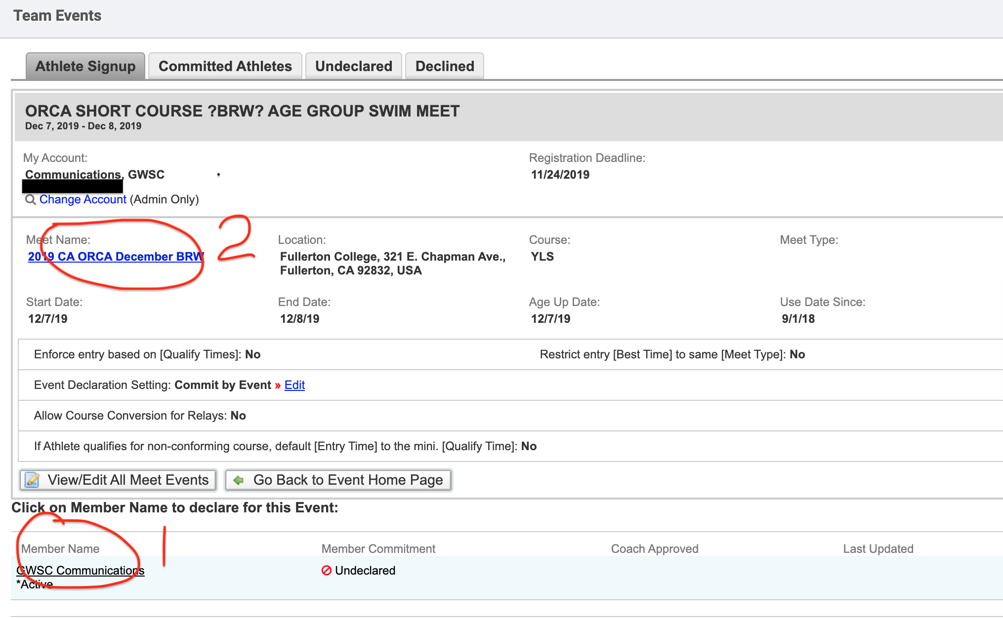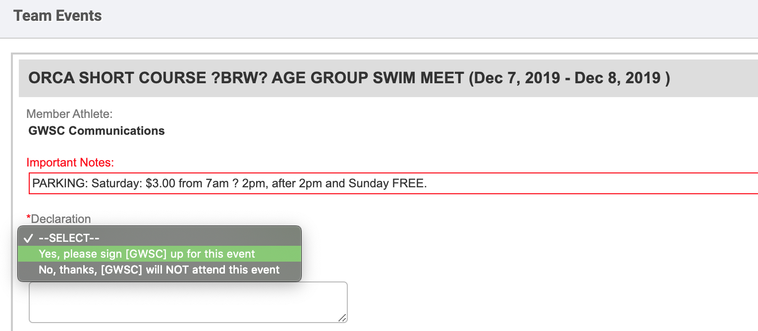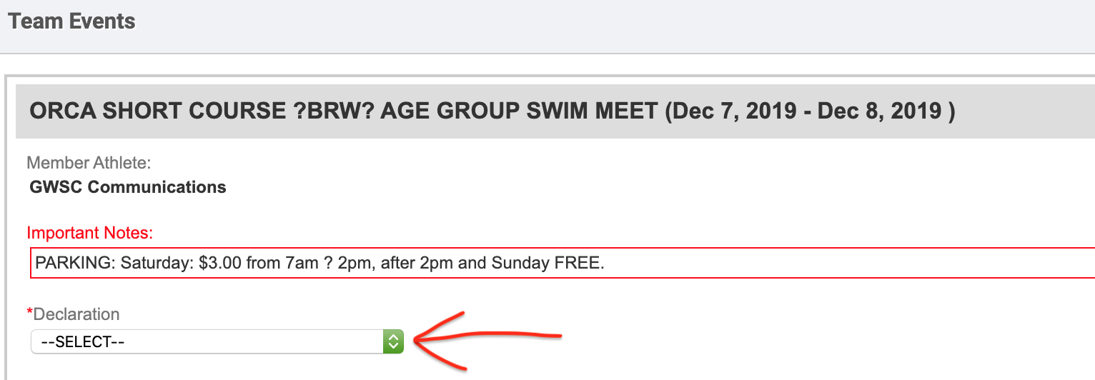 Once the commitment is set, the page will extend to the events offered at the swim meet. Pay close attention to the rules of each event, which will be listed at the top of the page.