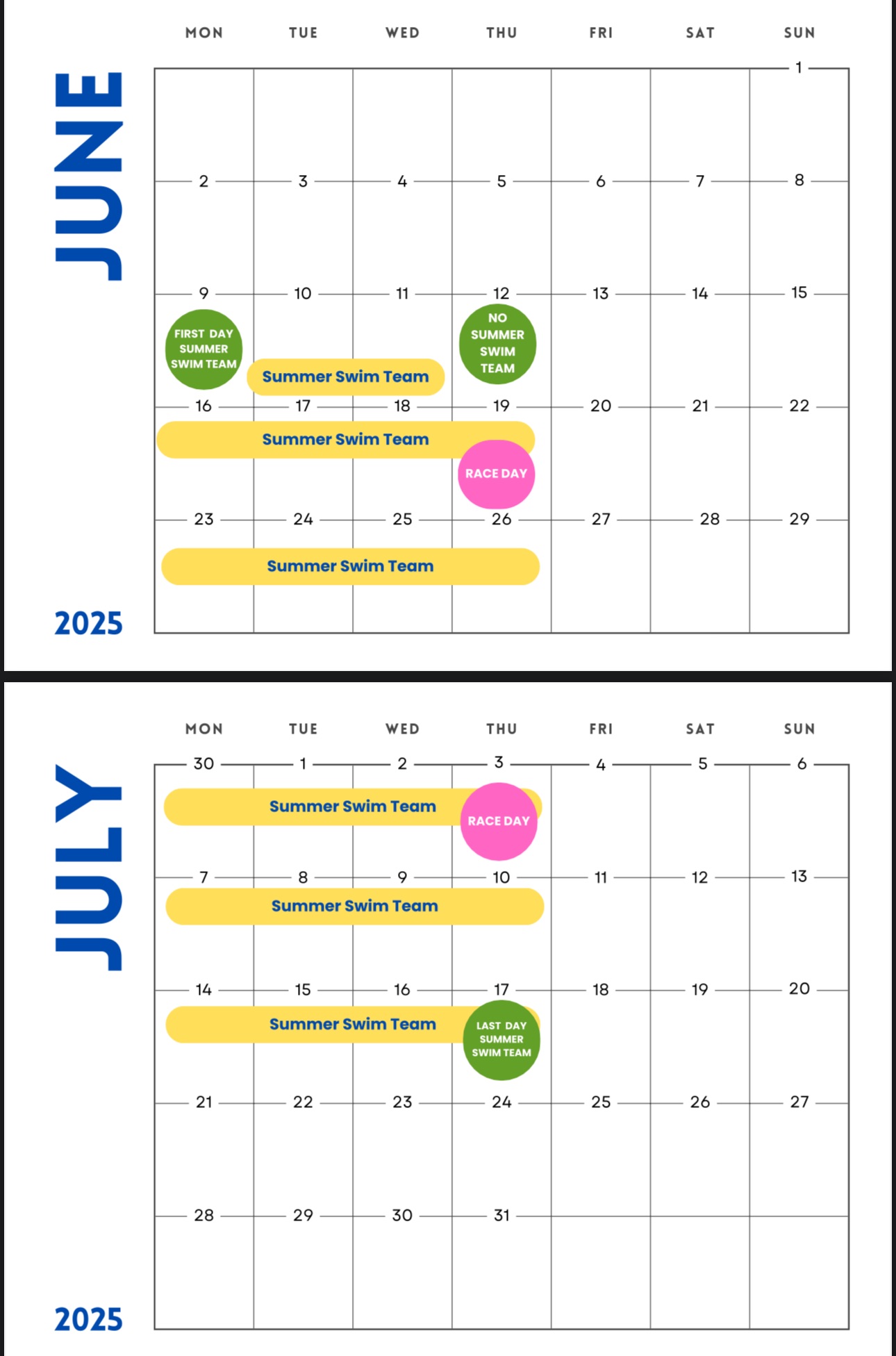 Practice Schedule: Monday thru Thursday 3pm - 4pm. Swimmers are allowed to come to the Friday 1:00pm-3:00pm recreational swim offered by the facility for $3 if they are a member of the summer team