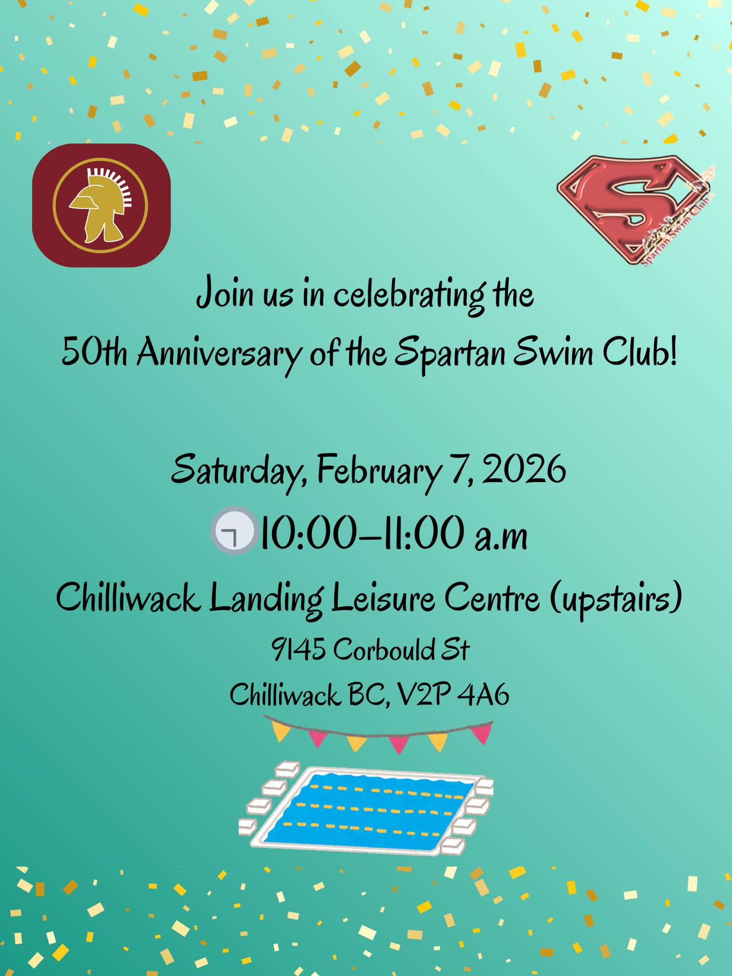 Please join us in celebrating the Spartan Swim Clubs 50 year anniversary February 7th from 10-11:00am at the Landing Centre. We will be updating our clubs success banners and there will be snacks and refreshments. Everyone is welcome to attend and we encourage you to pass this information on to the public, friends and past Spartan members.