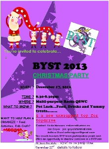 BYST Christmas Party!! Come join the fun on Dec 17th, 6:30PM - 8:30PM MORE INFORMATION ABOUT THIS EVENT. Remember to signup for Potluck!!