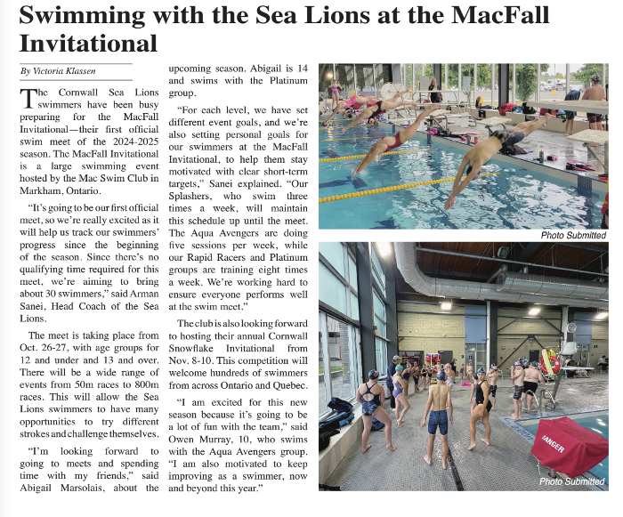 The Cornwall Sea Lions swimmers have been busy preparing for the MacFall Invitational-their first official swim meet of the 2024-2025 season. The MacFall Invitational is a large swimming event hosted by the Mac Swim Club in Markham, Ontario.