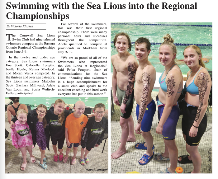 The Cornwall Sea Lions Swim Club had 9 talented swimmers compete Eastern Ontario Regional Championships from June 5-9.
