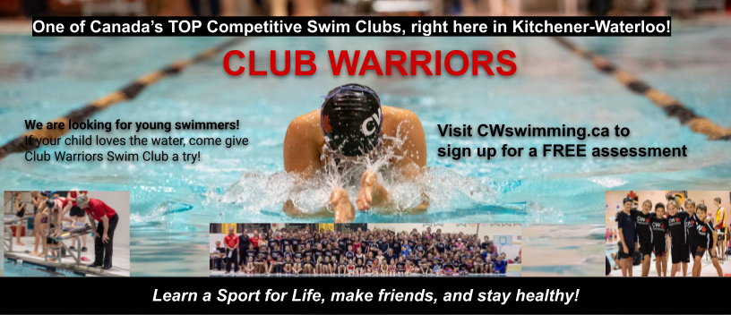 Club Warriors is a non-profit, year-round competitive swim club, providing children and youth swimming programs ranging from learning-the-strokes to highest-level competition, through participation at Swim Ontario sanctioned meets and national level events.