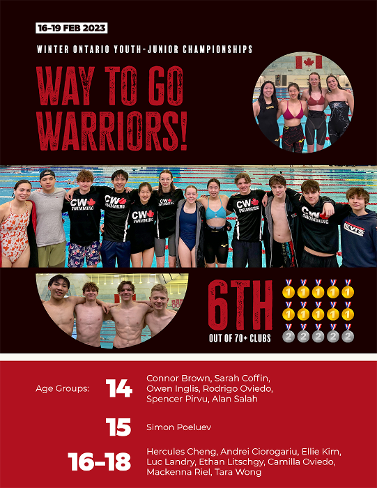 Club Warriors kicked off the 2023 Winter Championship Season on February 16th on opening day of Ontario Youth-Junior Championships. Congratulations to all 15 swimmers from our Elite and Junior Elite teams who travelled to the Etobicoke Olympium to compete in this 18 & Under championship event. For many, the goal was to better their lifetime bests and, for some, to qualify for the upcoming provincial and national meets in March. We are happy to report that our Warriors did not disappoint.