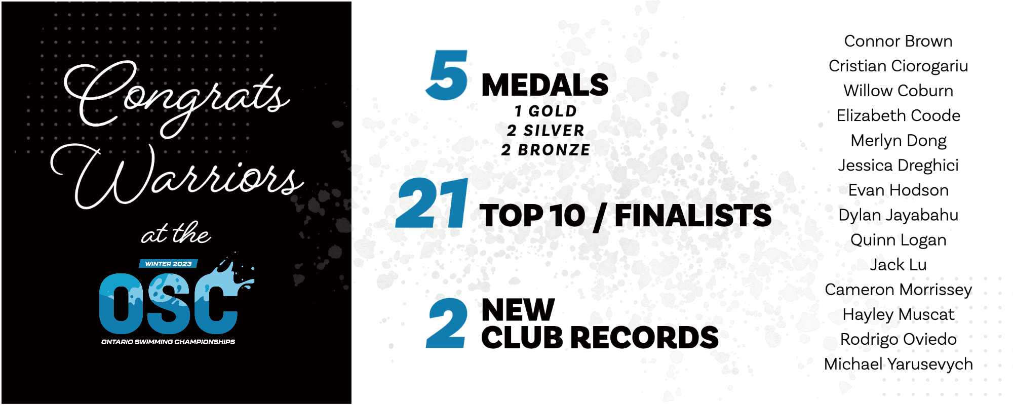 A massive thank you to Coach Russ for leading our 14 Warriors to such success at the 2023 Winter Ontario Swimming Championships. Thanks also to all supportive parents during this 4 day event. Overall, the CW club swimmers had an exceptional showing at the 2023 Winter Ontario Swimming Championships. The team put in a lot of hard work and their efforts paid off in a big way. Go Go Go Club Warriors!