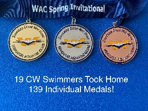 WAC Spring Invitational March 25-27, 2022 70 CW swimmers travelled to Windsor to compete in the first long course meet since 2020! Out of the 9 clubs attending this 3 day meet, Club Warriors came away with 139 medals achieved by 19 different swimmers. There were 41 individual events won with many of these swimmers also achieving Top 10 Ontario LC Ranking for their single age grouping! Event Winners: Connor Brown 13 400 IM Elayna Zunic 12 100 Free, 200 Free, 50 Back Hercules Cheng 15 100 Fly Yehia Fath...