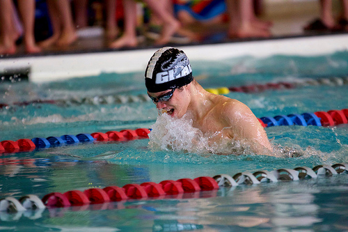 | Some consider the BUTTERFLY (pictured right) to be the most beautiful of the strokes. It features a simultaneous recovery of the arms over the water combined with an undulating dolphin kick. In the kick, the swimmer must keep both legs together and may not flutter, scissors or use the breaststroke kick. Both hands must touch the wall simultaneously on the turns and the finish. | ![]() |