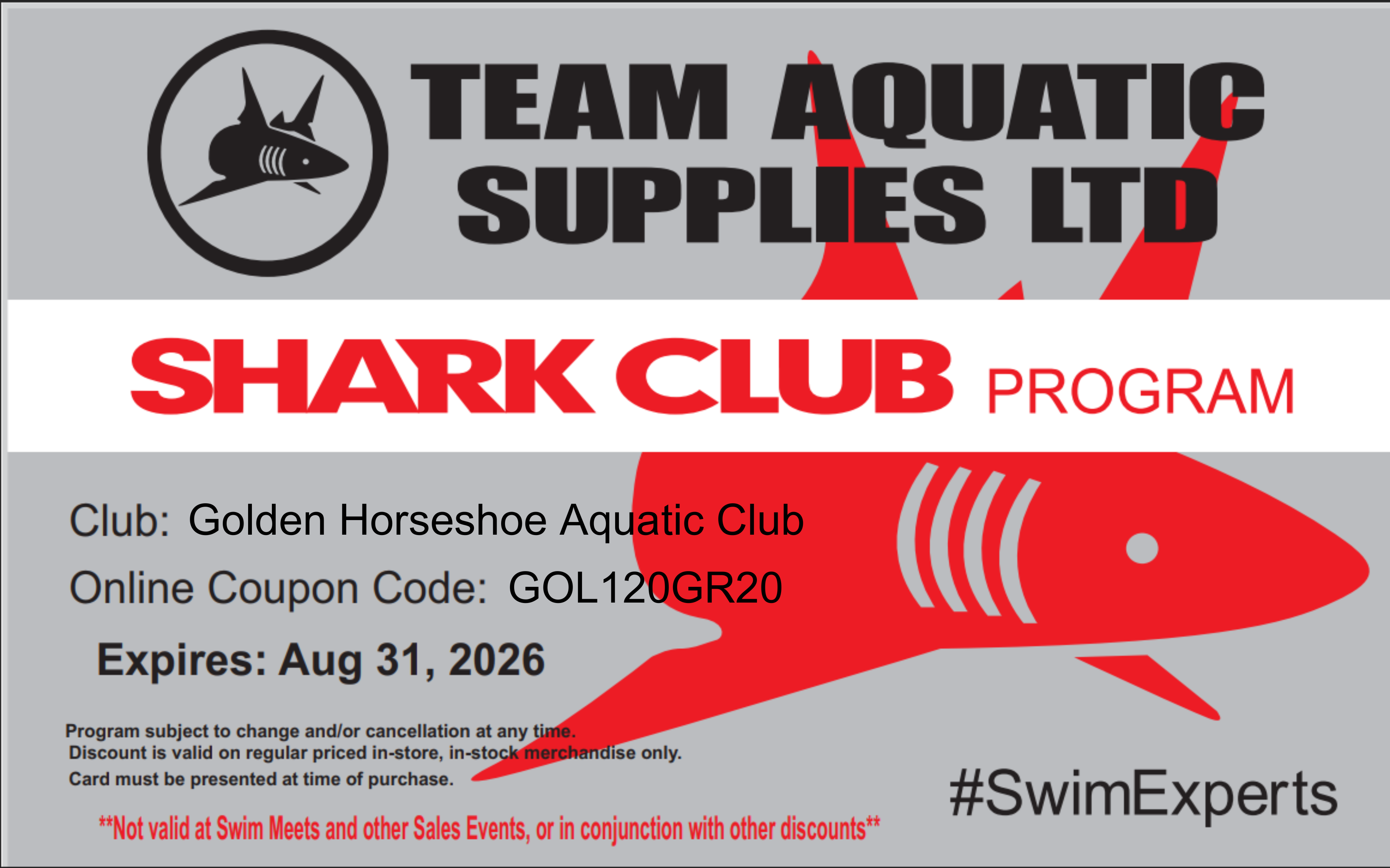 Here you will find important/usefull documents and information: The GHAC Shark Card is discount card for the Team Aquatics Supply store in Burlington. The card must be presented at the time of purchase to recieve the discount. Team Aquatics is located at 4155 Fairview St, Burlington, ON L7L 2A4. For directions click here.