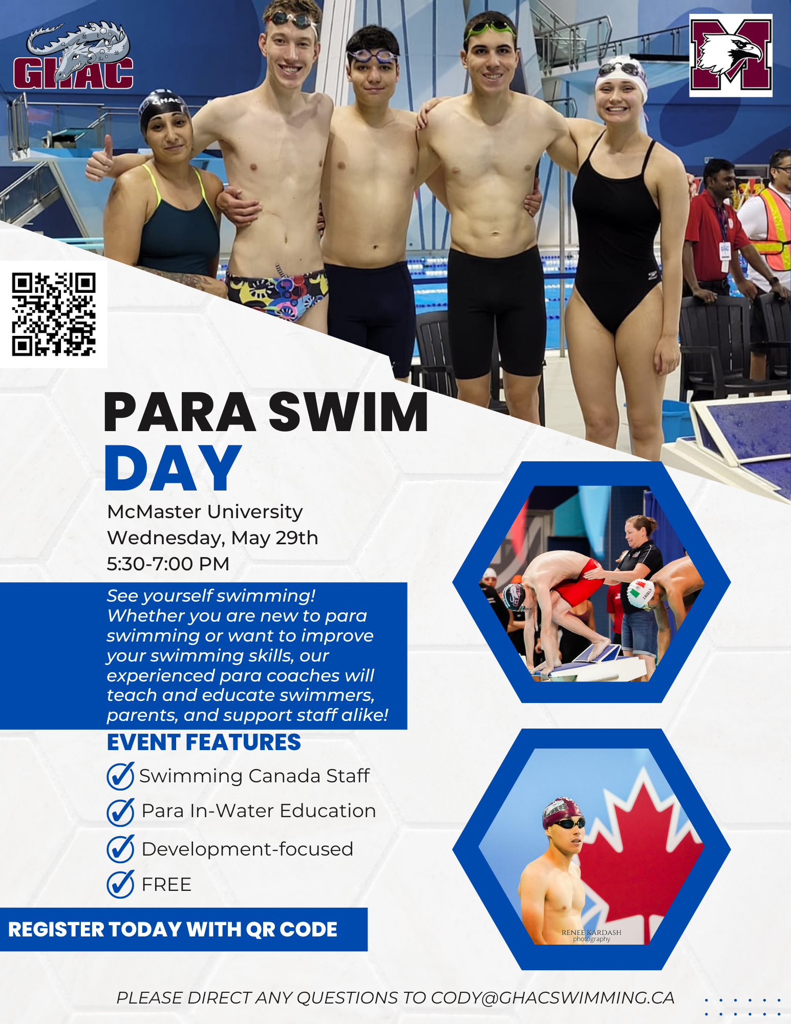 We are pleased to be offering a "Para See Yourself Swimming Day" at McMaster University on Wednesday, May 29th from 5:30-7:00 PM.