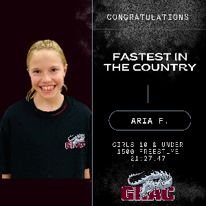Congratulations to Aria from our Junior Performance group for dominating the pool and setting the fastest time of 2024 in the country for Girls 10 & Under 1500m Freestyle! Your dedication and hard work have truly paid off. Keep making waves, Aria! #GHACFast #HardWorkPaysOff