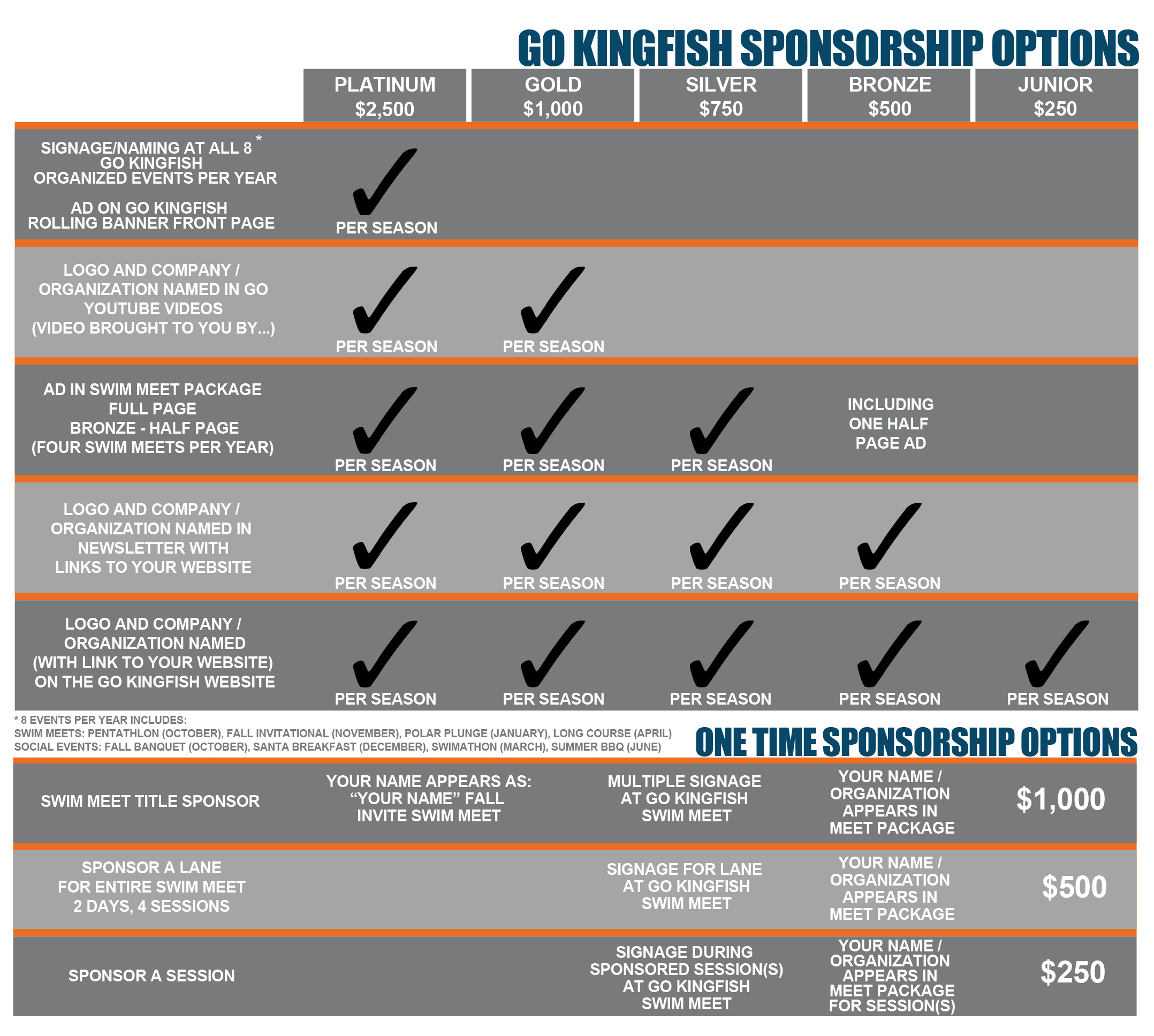 When you become a sponsor, your organization's name and logo will be displayed on our website, in our monthly newsletter, and in the printed meet-package documents at our swim meets.