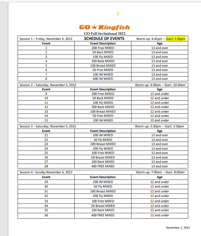 - Saturday November 05, 2022 - 12/Under: Session # 2 Meet Program/Heat Sheet