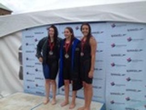 Sara Whelan scores a bronze medal in 400 Free on the final day of racing at Age Nats. Swimming out of 10th place from prelims she wasted no time in going for it. Rocketing to the lead over the first 200 m she put a big lead on the others who worked to reel her in. Another exiting finish saw her claim the bronze after a furious last charge by the other girls. Her third place was also a bt as well.
