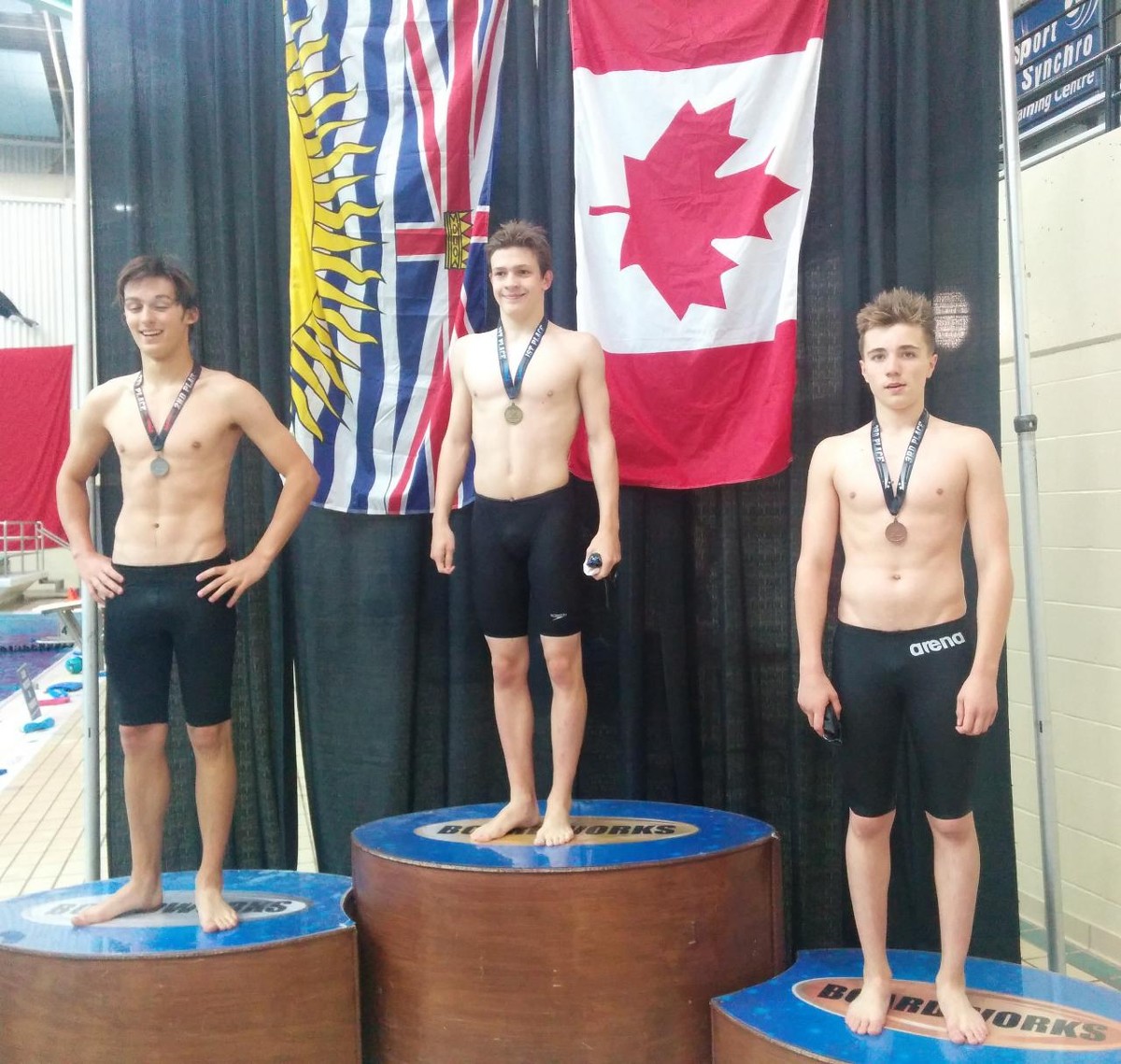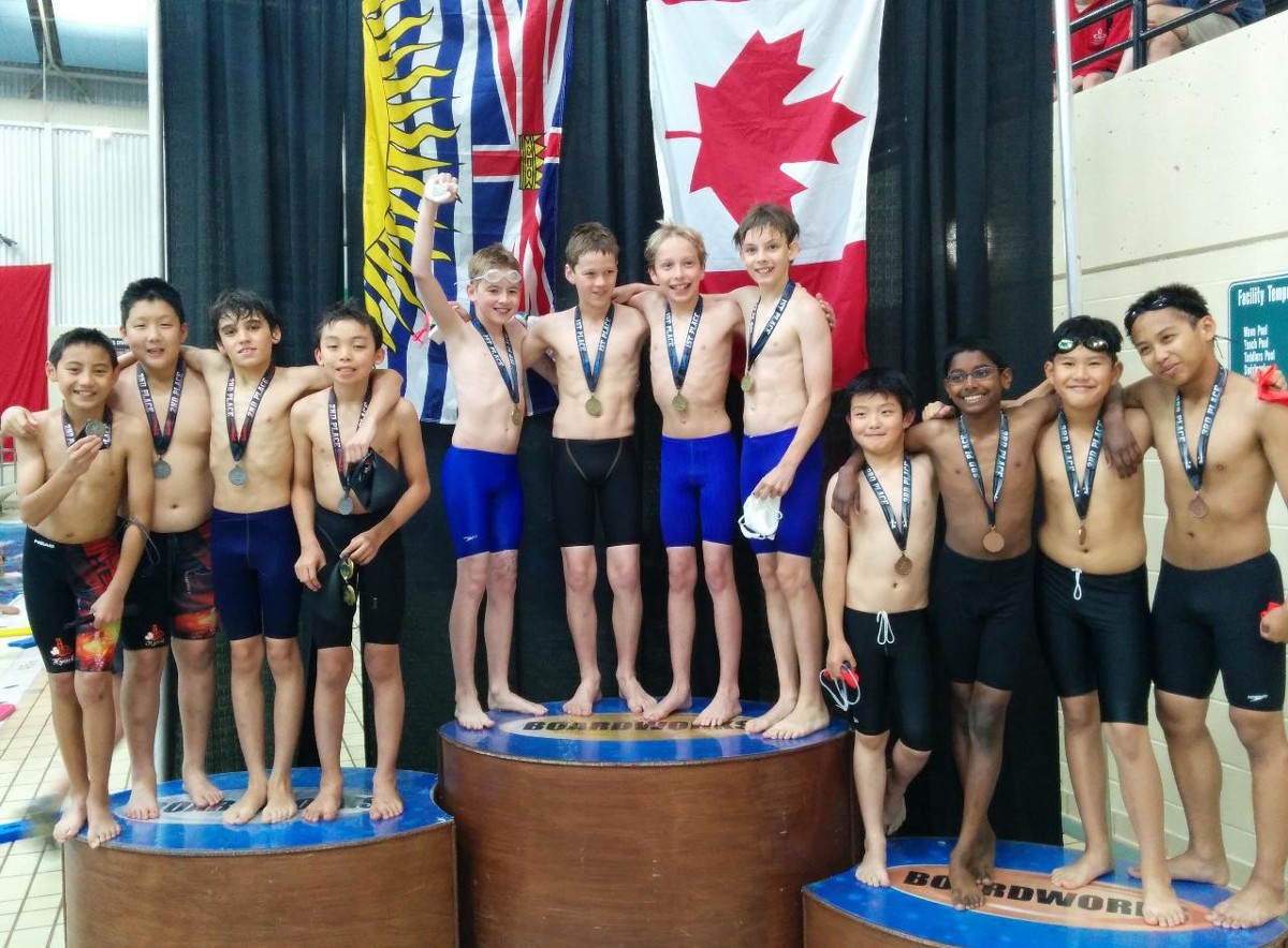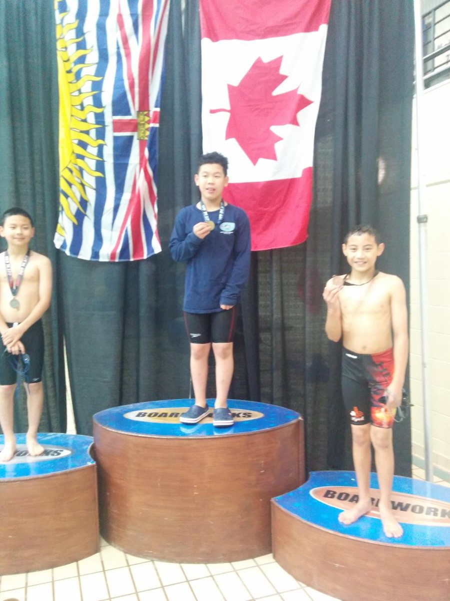 At the relays. Gold for 14 and under boys 200 Medley, congratulations to Jakob, Eric, Amar,Graham. Silver goes to 12 and under 200 Medley relay, Dragos, Matteus, Ethan,Jeff. 5th place for girls relay Emily, Natalie, Victoria and Nicole. Well done everyone!!!