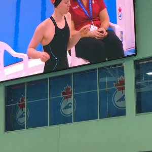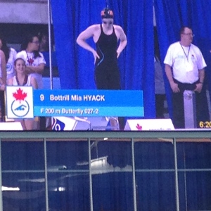 Mia Bottrill races to 10th place in the A final. This was her first A final and kept her streak of having made a second swim at every national championships or Trials since she qualified for them. It was also her first experience at the ready room! Chris Baker swam to a best time in his heats of 200 fly. His time of 205.9 was fastest BC swimmer 16&u and should put him on the Western Canada Games team this summer. Stella Jin broke Pam Rai's 1980 50 free record...