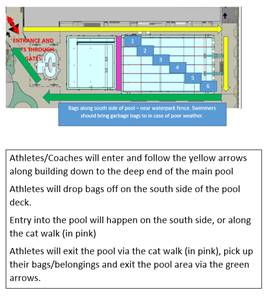 A lifeguard will meet the user groups and allow them access to the pool area once it is time for their session. The entire group (athletes and coaches) needs to enter the pool at the same time. Please review the one way direction traffic flow image below: