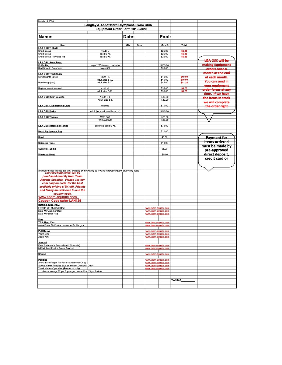 The Langley & Abbotsford Olympians Swim Club is offering 75% off on all equipment with the old L&A OSC Logo on it. These items include, Hoodies, Sweat Tops, White T-shirts and Red Dryland T-shirts. We also have three Red Backpacks available and 2 mesh bags available at regular price.