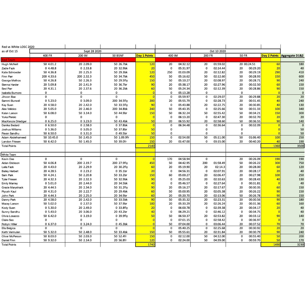 The Langley Olympians Regional, Provincial, AGP, and National Groups competed in their second Red vs White Time Trials! The Red vs White Time Trial Event is one of the ways that swimmers in these groups will test their swimming skill and competence as meets are suspended due to COVID-19. So far, we have seen a lot of swimmers swimming their personal bests, if not close to their best.