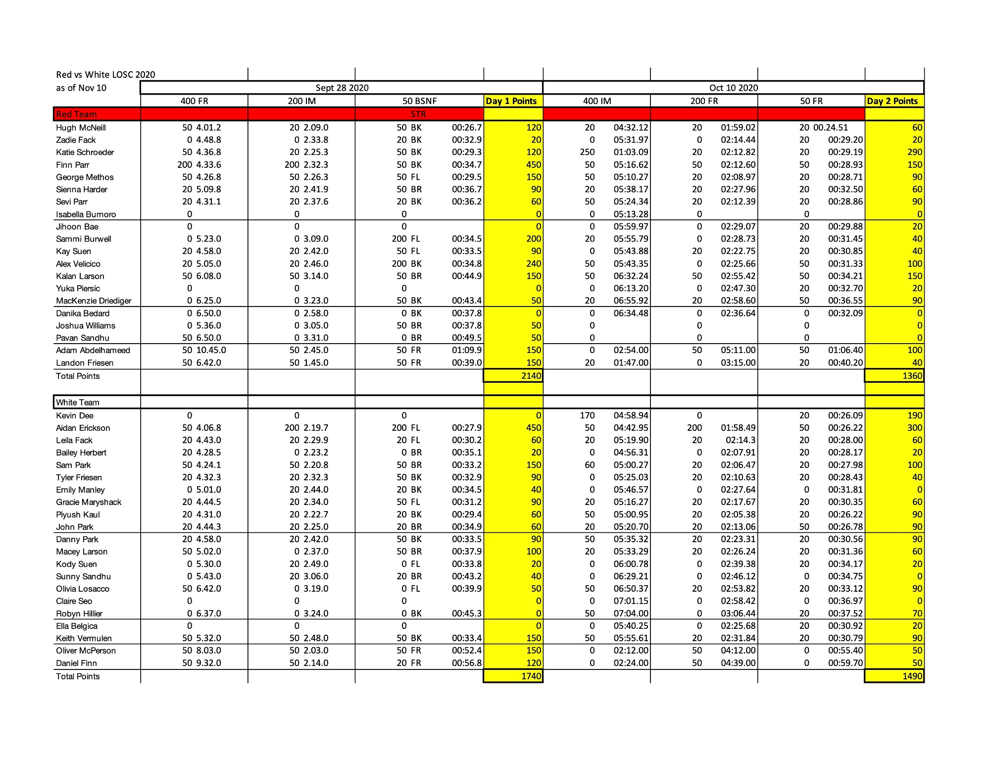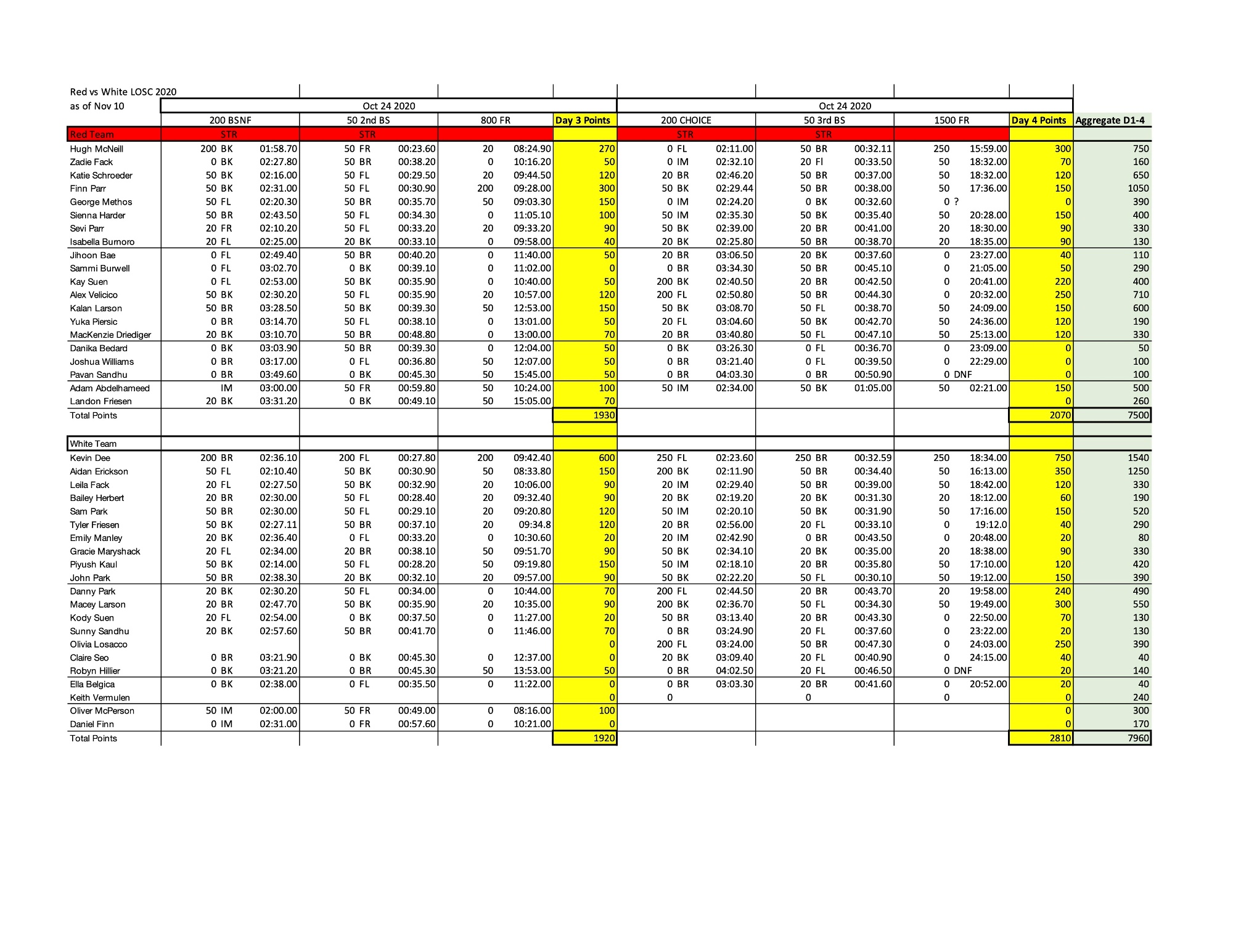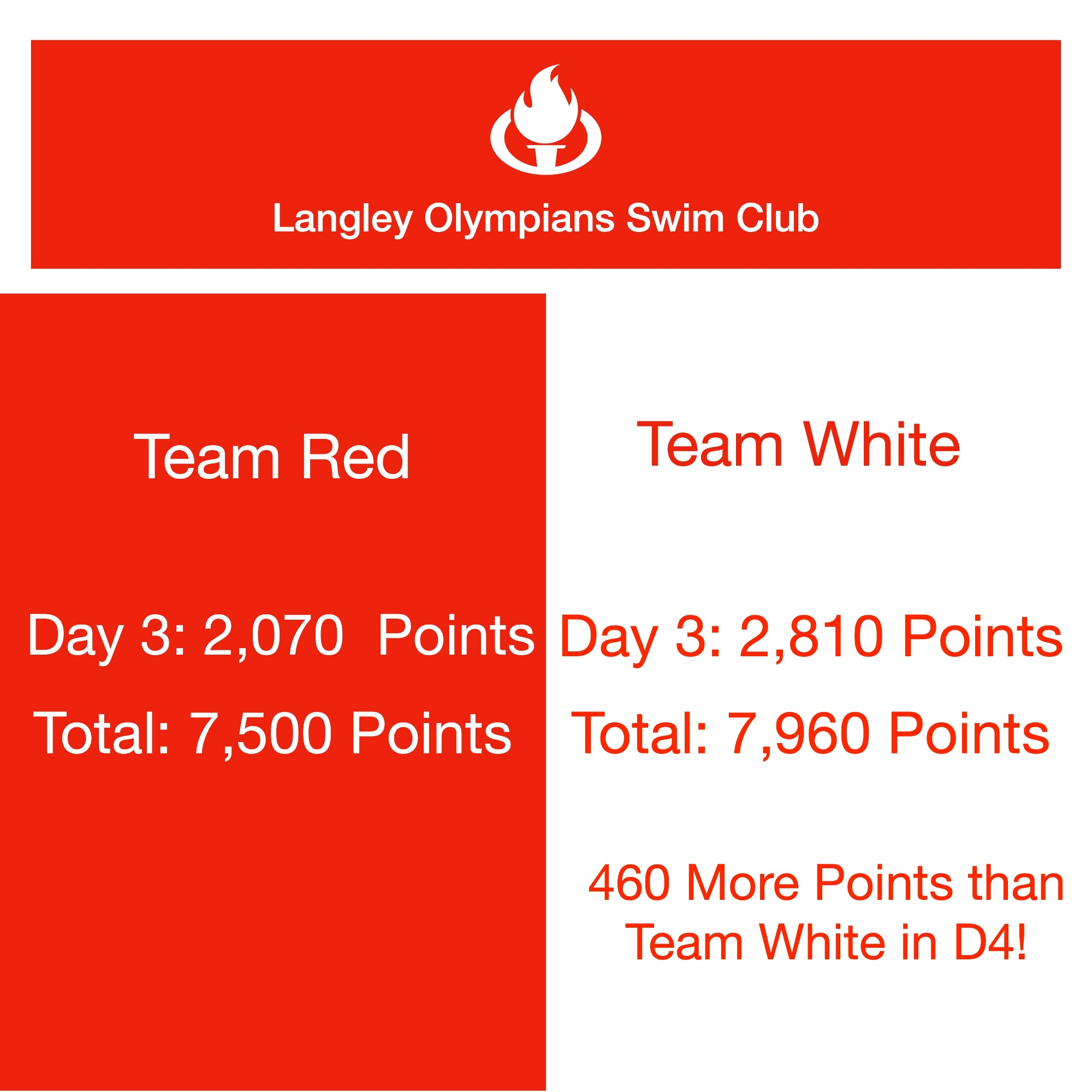 The Langley Olympians Regional, Provincial, AGP, and National Groups competed in their fourth Red vs White Time Trials! The Red vs White Time Trial Event is one of the ways that swimmers in these groups will test their swimming skill and competence as meets are suspended due to COVID-19. So far, we have seen a lot of swimmers swimming their personal bests, if not close to their best.