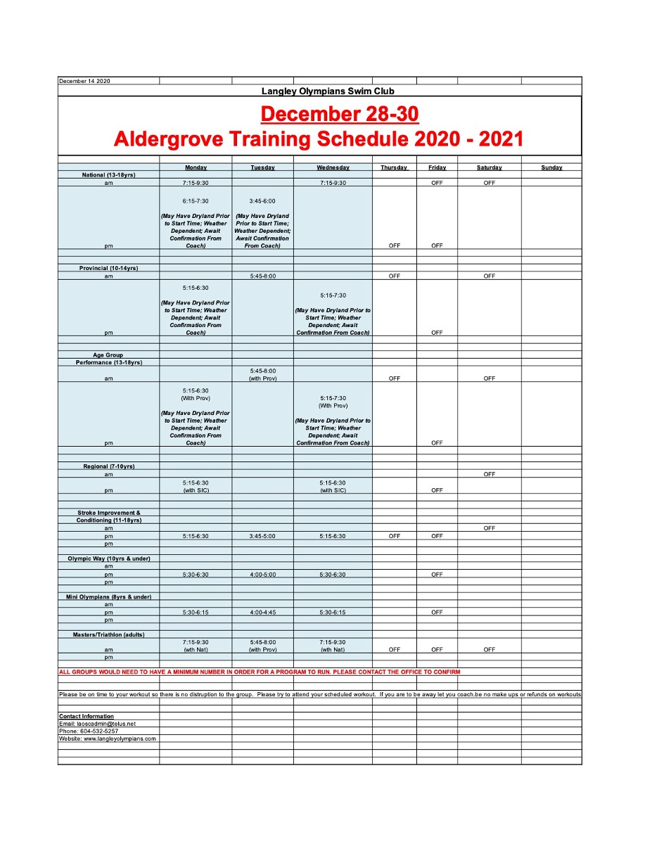 Olympic Way/Mini Olympians and Stroke Improvement Families - should your child/ren swim on the days of Friday to Saturday, we MAY be able to accomodate you for a make up on Monday, December 28th. Please email the office by Thursday, December 17. This will be a first come first serve slot.