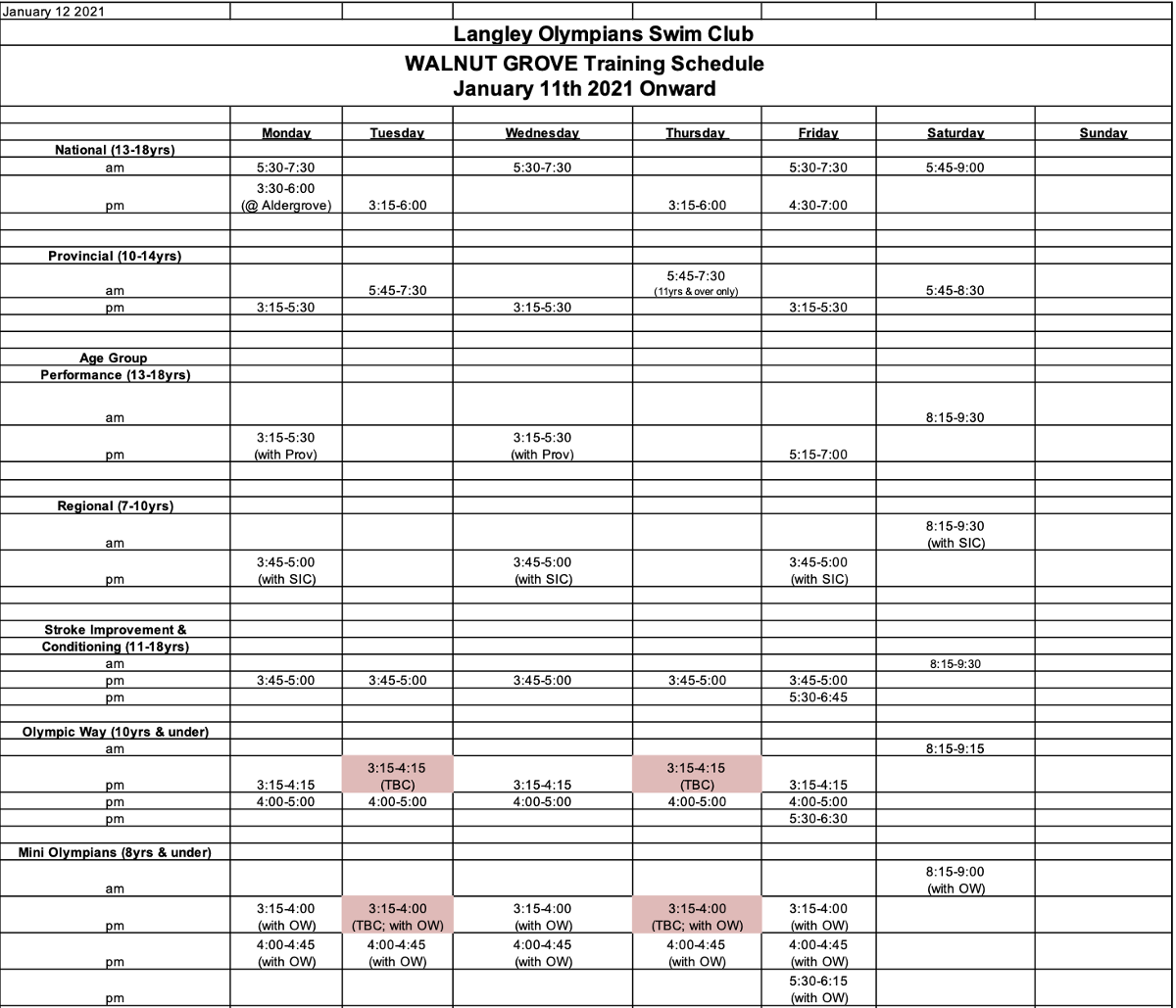 As mentioned in our email Monday December 28th, we have been allocated pool time and space at the Walnut Grove Pool starting Monday, January 11th, 2021. We are pleased to announce our CONFIRMED training schedule - find attached (subject to public health order and the situation allows) as we move our programs back to the Walnut Grove Pool. This would mean that we will be ceasing our operations out of the Aldergrove Pool (for most groups) once we have returned back to Walnut Grove.