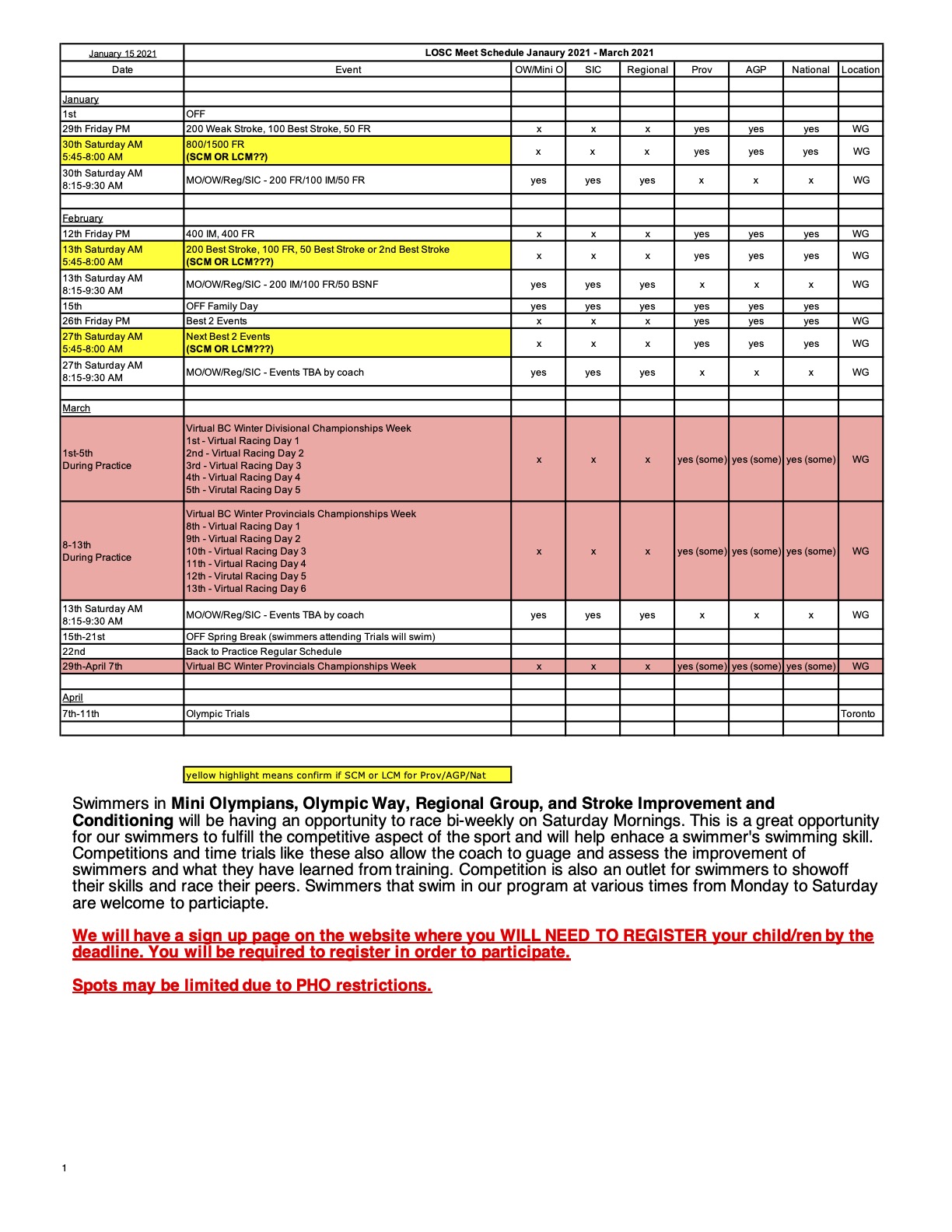 Please find the attached meet schedule for the January to March 2021 block. Please note that this schedule is subject to change. The most up to date time trial/meet schedule will be on the website under "Resources" --> "Swim Meets".