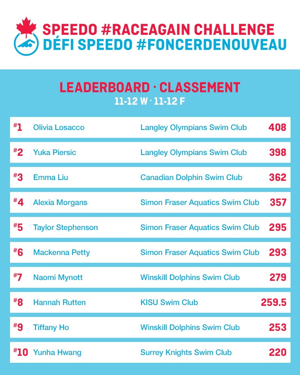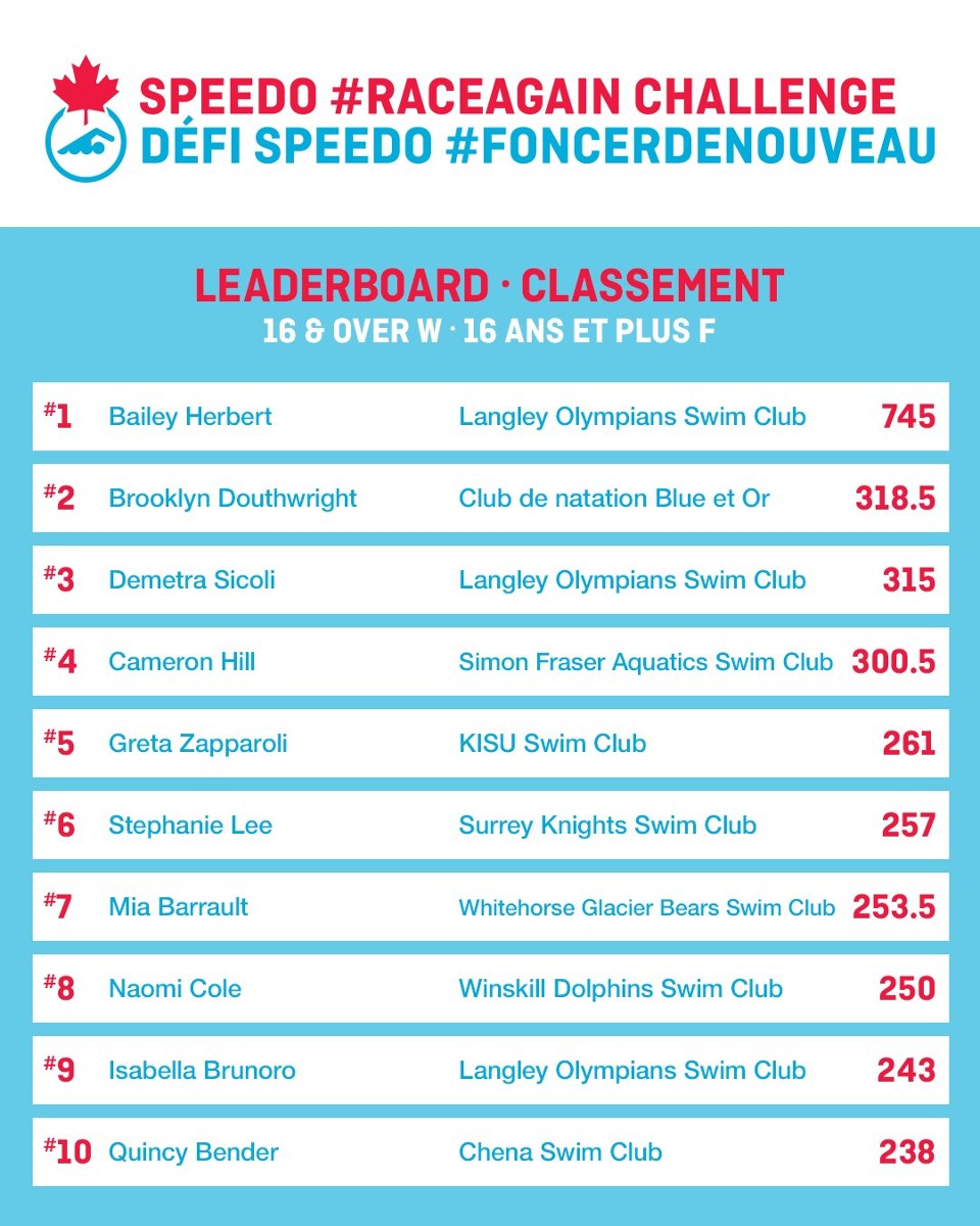 More results are in this website: https://www.swimming.ca/en/raceagain/