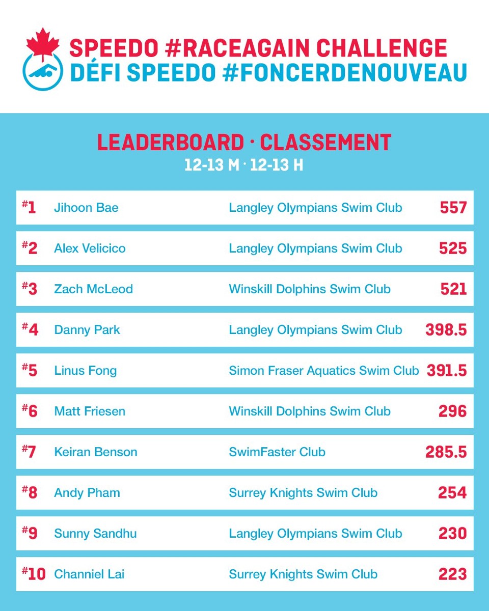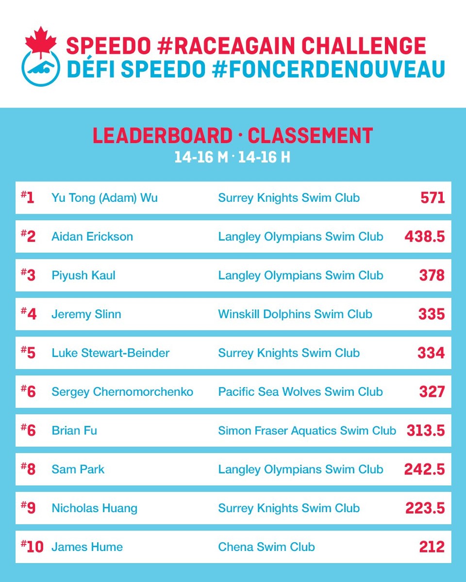 The Langley Olympians Swim Club’s National and Provincial Groups participated in the Swimming Canada #RaceAgain Challenge. The Speedo #RaceAgain Challenge is a virtual ranking database open to all registered Swimming Canada club members. This is an opportunity for swimmers to get up on the block and #RaceAgain. The #RaceAgain Challenge is to be done over one pre-stage and 3 main stages.