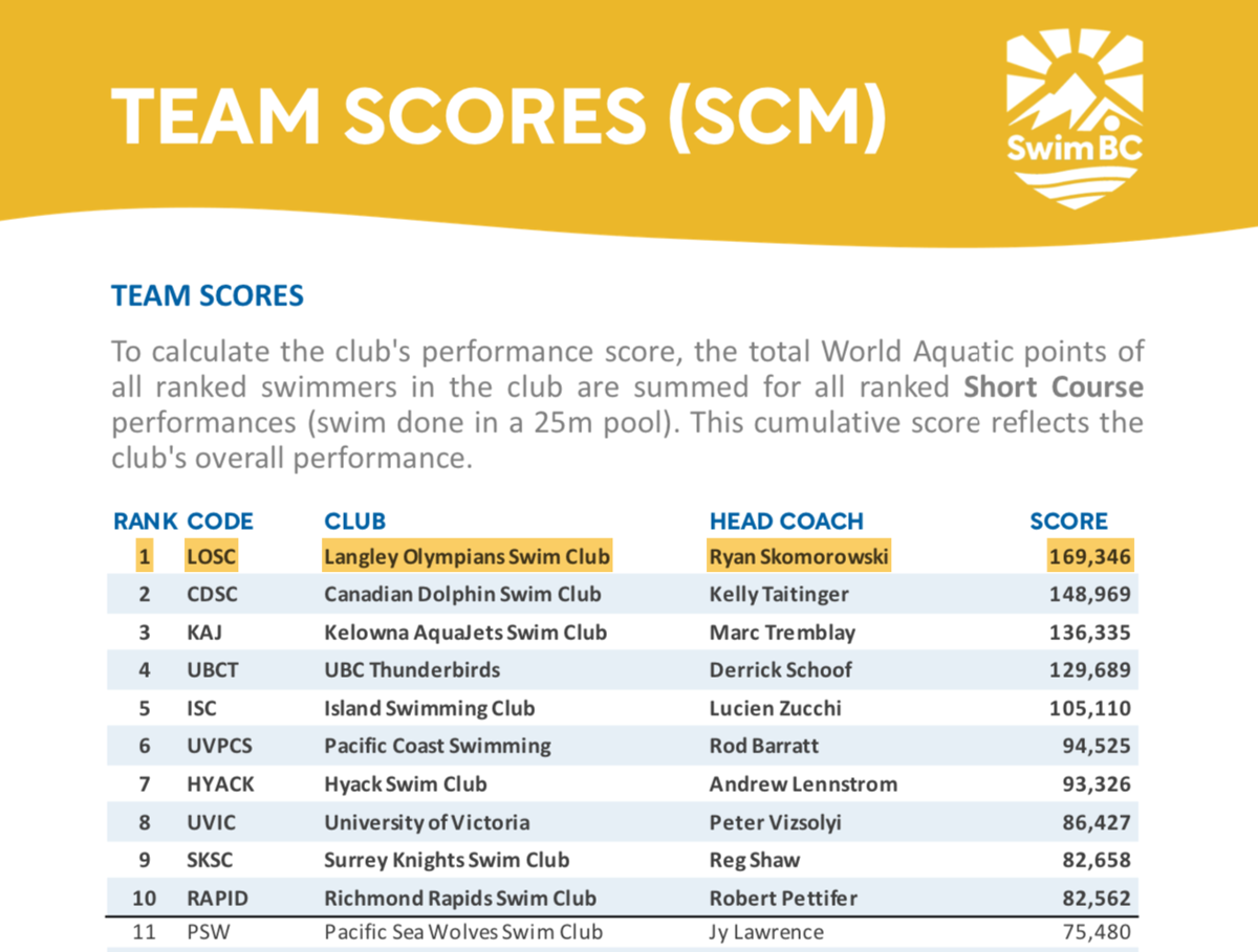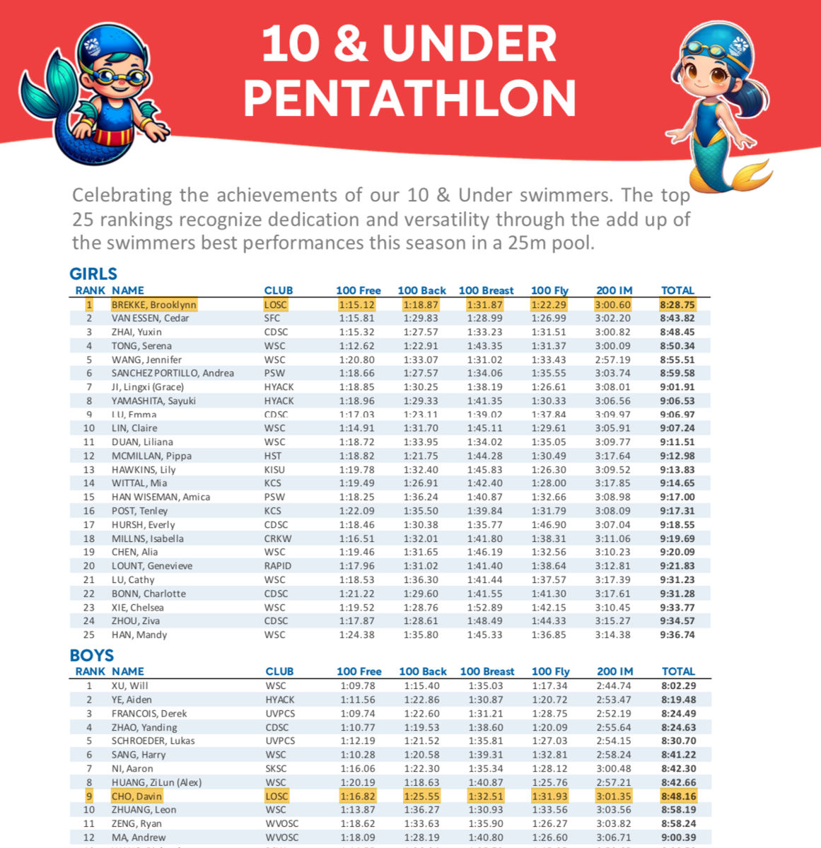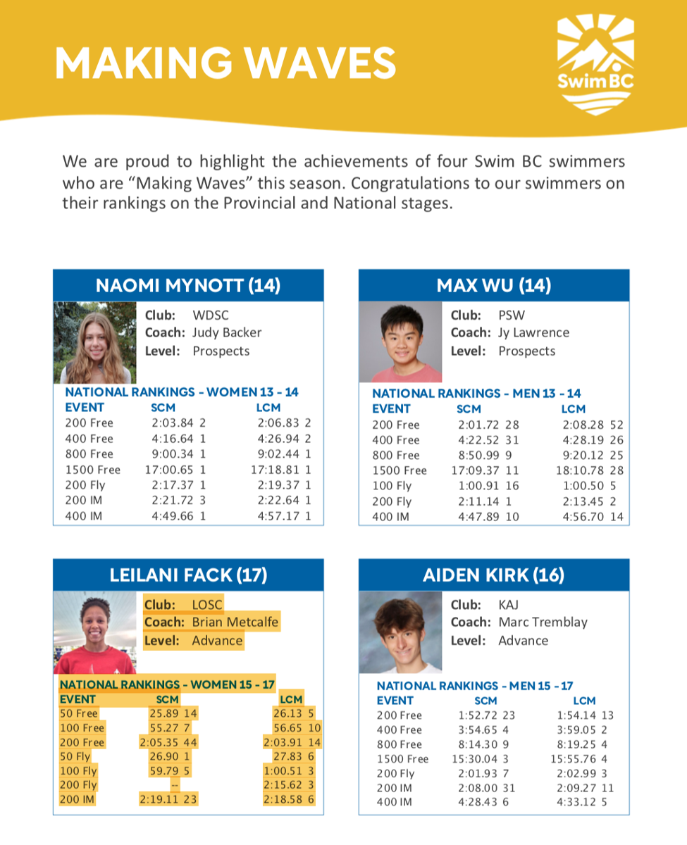 Swim BC just released their second Performance Report which showcases the top times in the Province and Country for each event from September 2023 to March 2024. It also highlights the top teams, where LOSC places first for both Long Course and Short Course! You will also notice that there is a 10 & Under Pentathlon, which is the top combined times for each 100m event and 200 IM. Brooklynn Brekke topped the list and Davin Cho came in 9th for girls and boys, respectively. The “Making Waves“ section shows off swimmers who stand out in the country, with LOSC Leila Fack taking one of these coveted positions. Click Here to check out the full report.