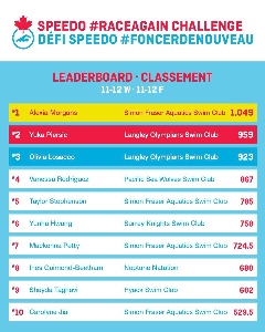 The Langley Olympians Swim Club has won the Small Team Award and placed second overall in the Speedo Swimming Canada Race Again Challenge! Over the past five months Swimming Canada has launched and virtual swimming competition open to all Swimming Canada registered athletes. This virtual competition spanned across three stages where points are cumulatively added over the past five months. Many LOSC Swimmers placed in the top 10 of the leader boards in their respective age groups. Congratulations to the following swimmers for placing top 3 in their age groups....