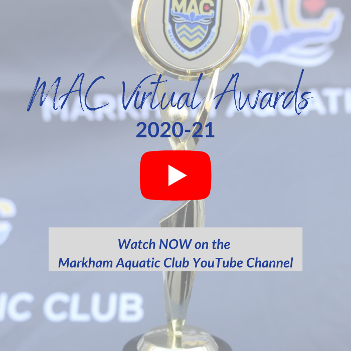 The new MAC Virtual Awards 2020-21 video was uploaded to the MAC YouTube Channel November 10. The 16-minute video looks back at an unprecedented season for MAC, including footage of MAC swimmers at the 2020 Canadian Olympic Swimming Trials, clips and images of MAC Swimmer of the Year and MAC Award recipients for High Performance, Canadian Ranking #1, Olympic Trial Qualifiers, Club Record Breakers, Canadian Age Group Top 10 and Top 50, the coveted Coaches Awards for Improvement and Attitude, the MAC Porteous Memorial Award and 10 Year Volunteer Award recipients.