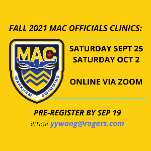 The chart below lists dates and times for Fall MAC officials training: Saturday September 25 and Saturday October 2, 2021. This year, training will take place online via Zoom. At least one member of each MAC family should pre-register for a Fall clinic. Pre-register by email to [email protected] before September 19 (Sunday) to reserve your spot. Saturday Afternoon Clinics Pre requisite Limited to September 25, 2021 3:00PM- 5:00PM Intro to Swimming + Safety Marshal For new official, age 14+ Must register with Swimming Canada after attending the clinic 20 attendees...