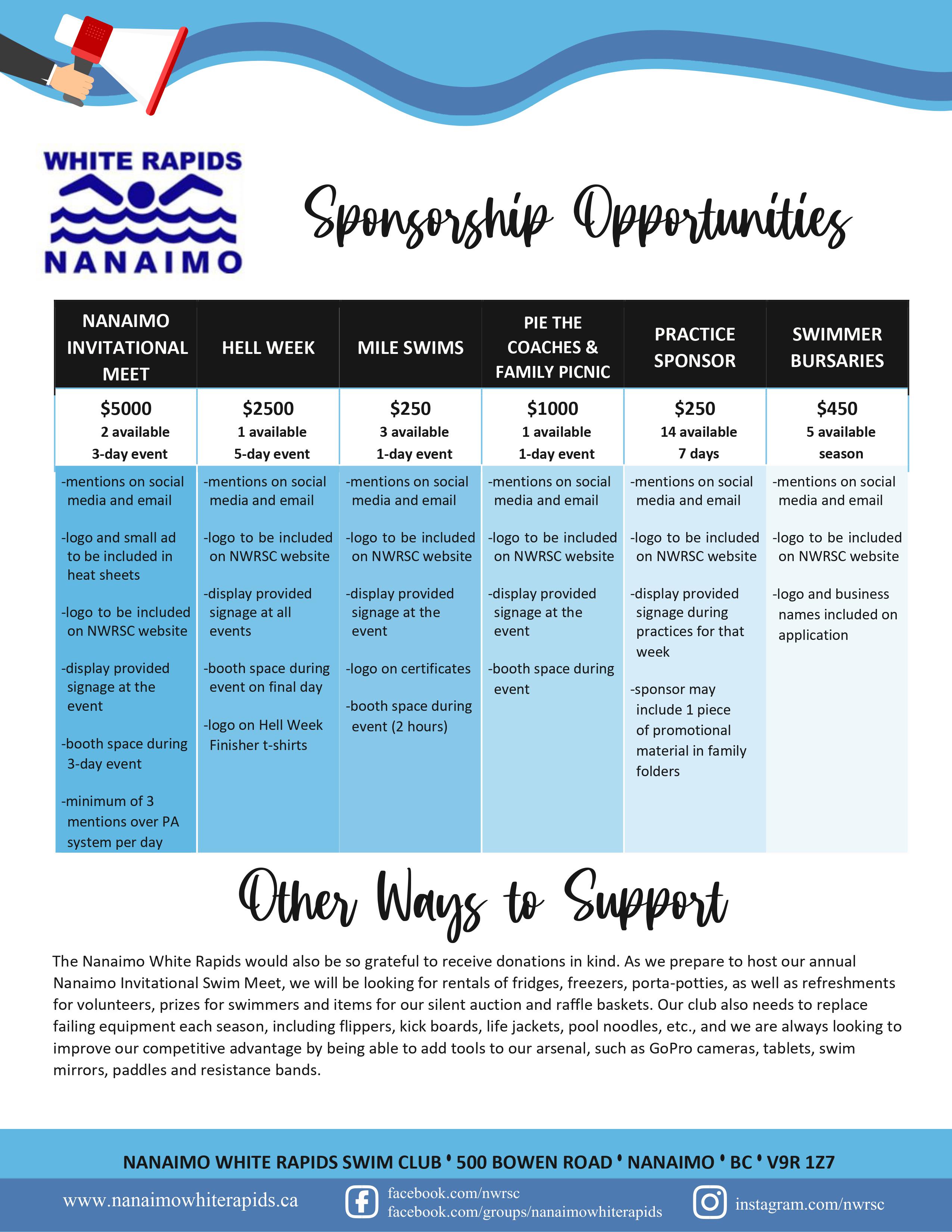 If you would like to become a proud sponsor of the Nanaimo White Rapids Summer Swim Club please contact us at [email protected]