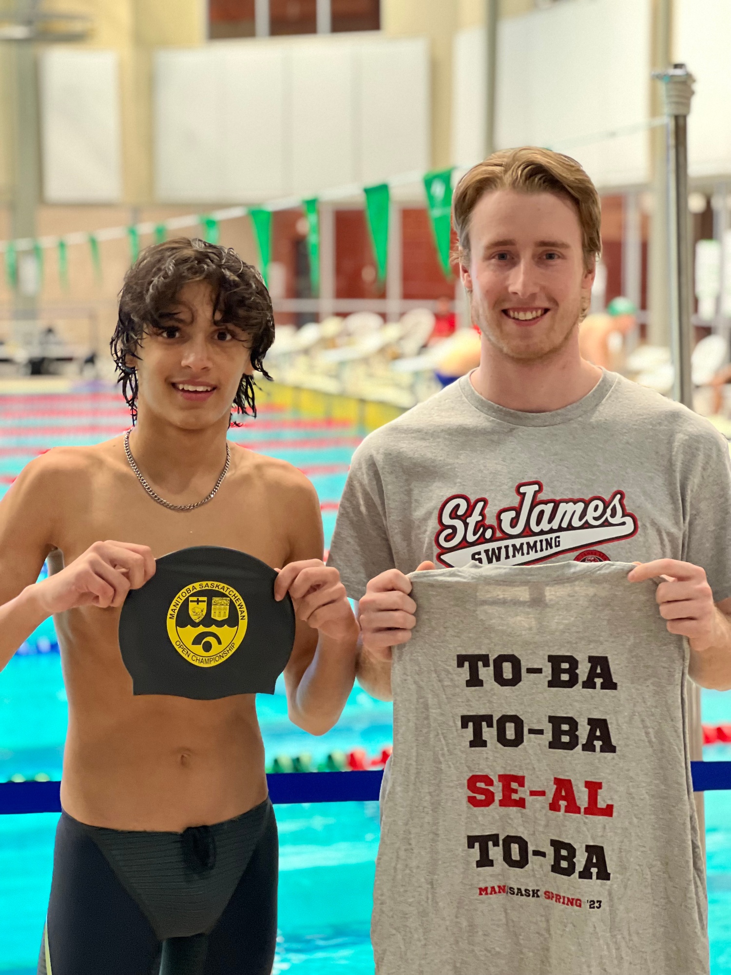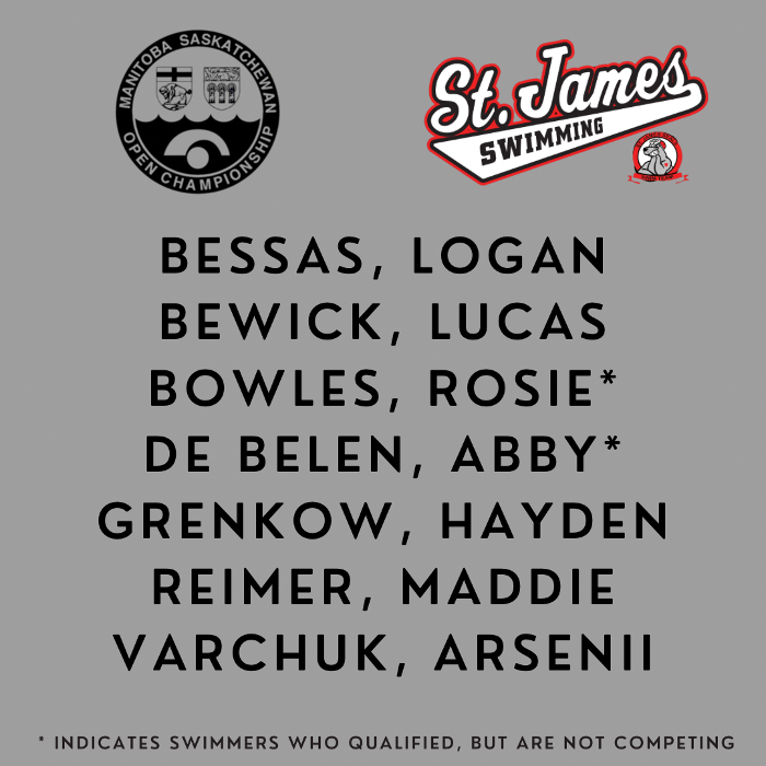 The St. James Seals trekked out west on Thursday for the first of two Manitoba Saskatchewan Open Championships (Man/Sask) this season. 6 Seals swimmers made the trip as Logan Bessas, Lucas Bewick, Hayden Grenkow, Maddie Reimer, & Arsenii Varchuk suited up to race, while AGE swimmer Max Wiebe took in the experience & did his best to keep Coach Cam in line on deck.