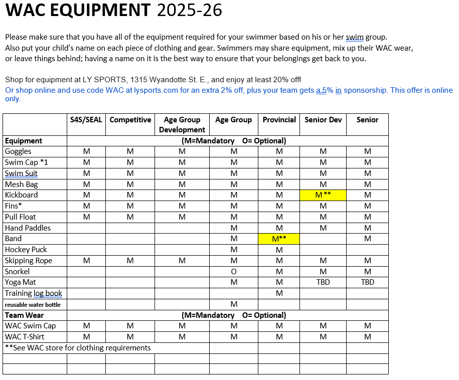 Please advise the sales staff that you are a WAC swimmer to get 20% off your purchase.