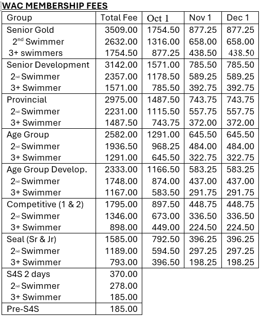 - It is important to note that membership fees only cover a portion of the above expenses and other major costs are covered by WAC hosted swim meets.