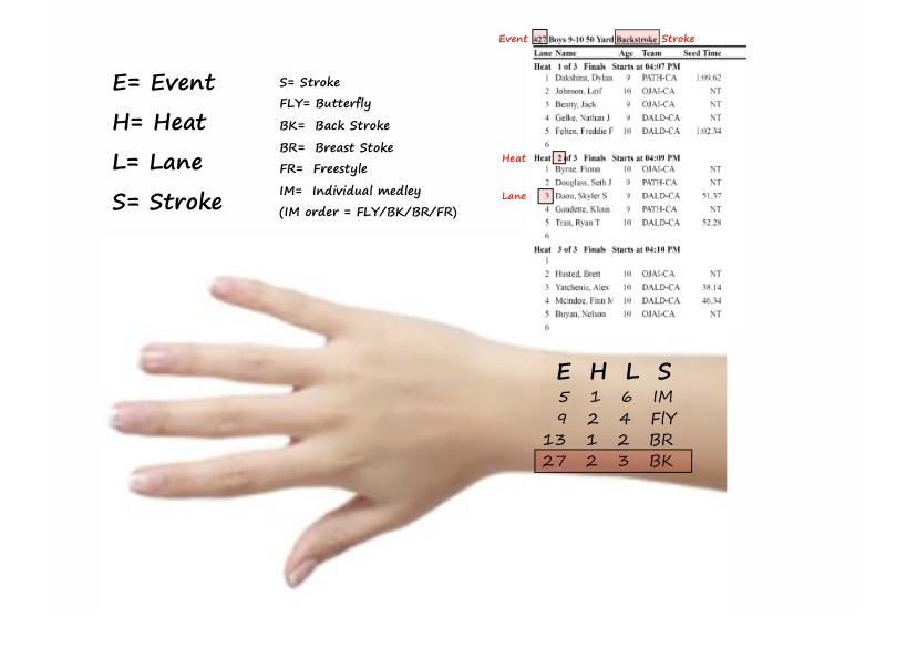 Hand Marking for Event, Heat, Lane, and Stroke- Picture guide to help new parents mark their kids at meets.