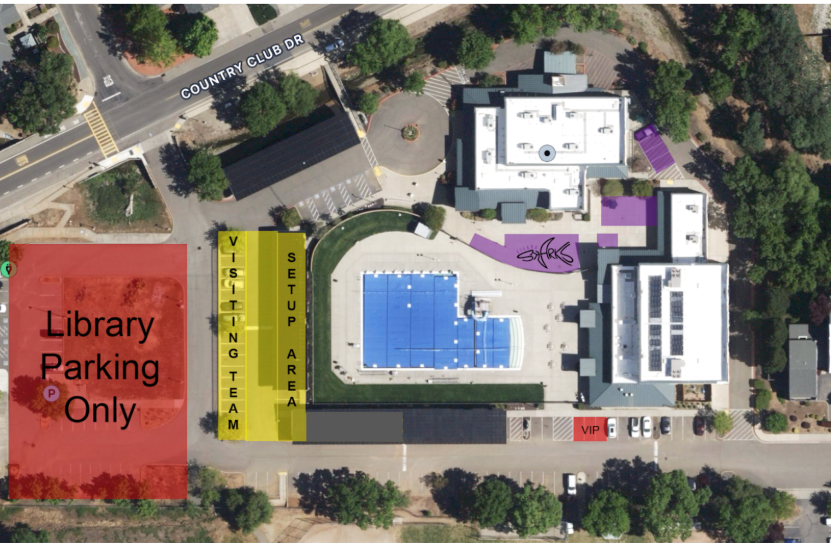 VISITING TEAM SETUP AREA: The yellow boxes shown in the map below indicate the dedicated setup areas for our visiting teams. Visiting teams may set up pop-up shades or hang out under the solar shade structures in these areas. Feel free to use the sidewalks in these areas as well. However, we must keep the driveway clear for emergency vehicle purposes. Please do not set up on the baseball field across the parking lot from the CSD pool, as there will be Little League games being played.