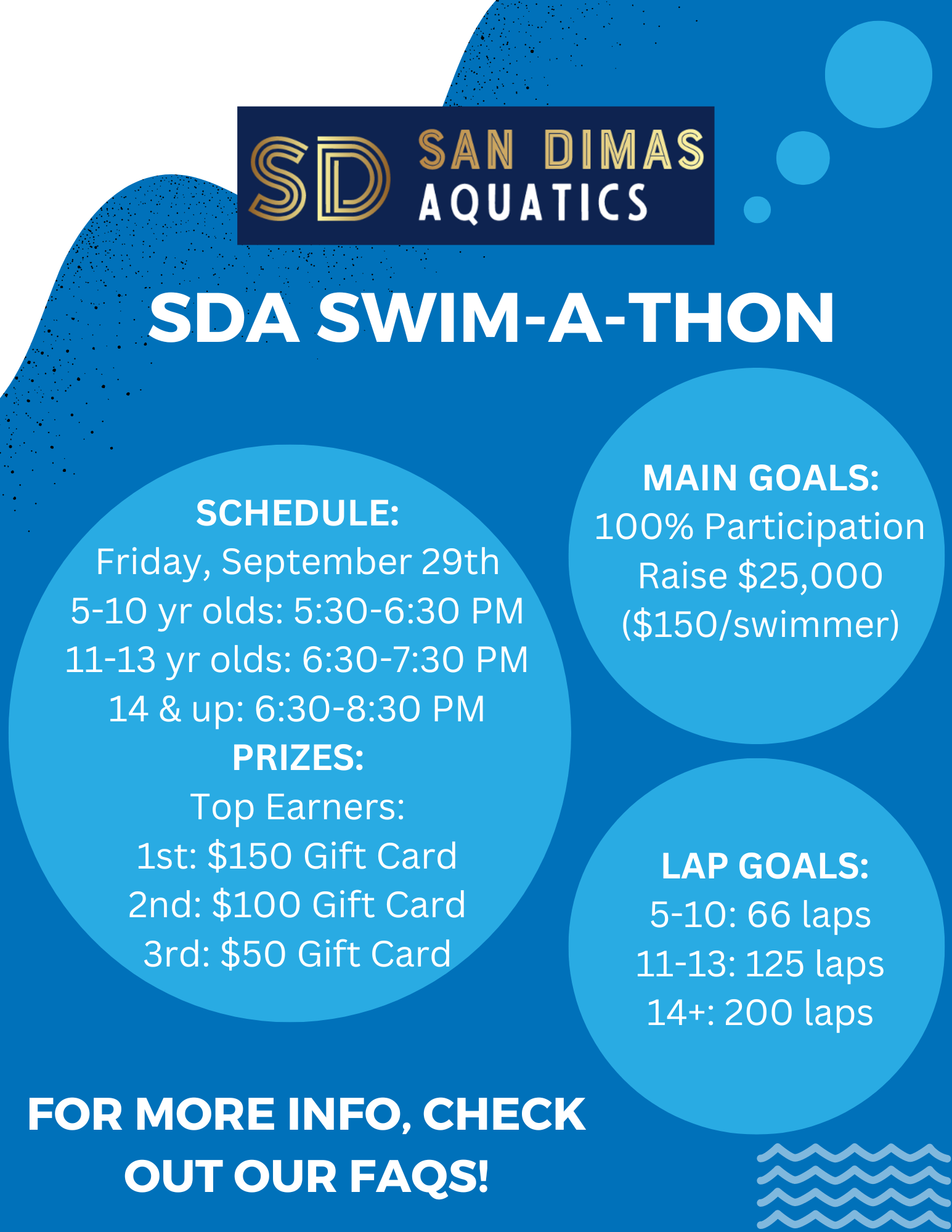Our actual Swim-A-Thon will take place on deck on Friday, September 29th. All swimmers will have the opportunity to participate by coming to the pool during the designated time and attempt to swim the age group lap goal. Swimmers reaching their goal will be entered into more raffle drawings. See attached flier for age group swim times.