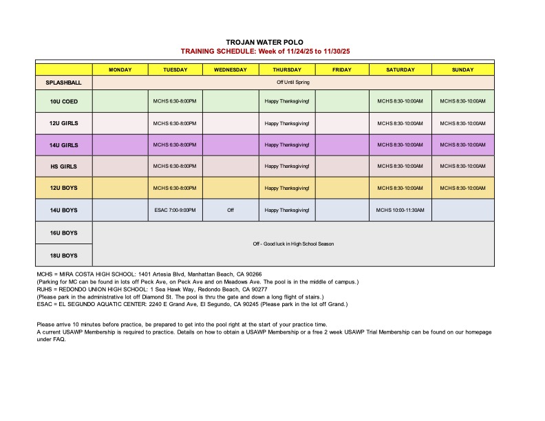 Trojan Water Polo - Training Schedule - November 24 to November 30, 2025
