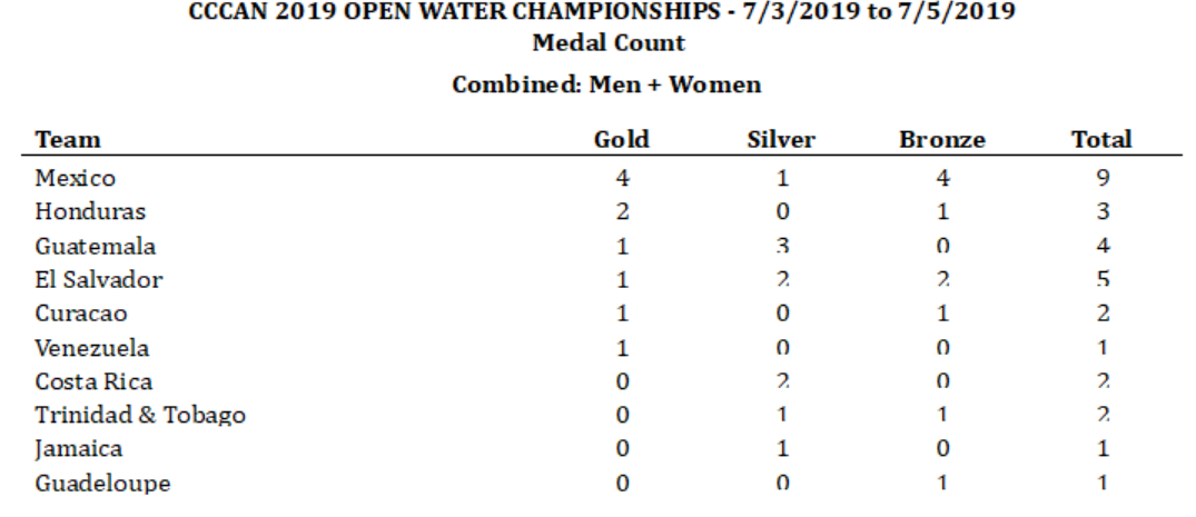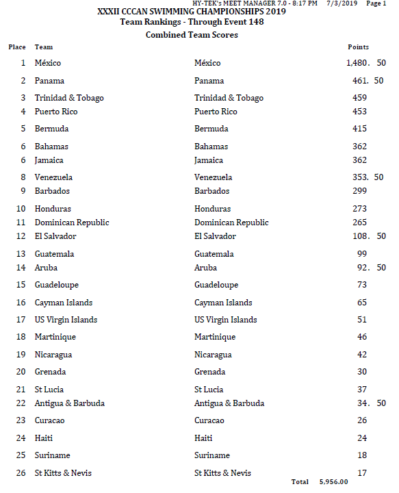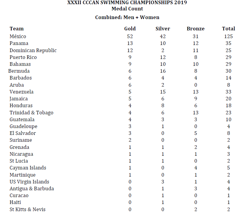 MEXICO was the big Overall winner with 1480.50 points, more than 1000 points ahead of #2 Panama. Winning every single age category and claiming 125 total medals, 52 of those gold, Mexico made a statement with their participation in Barbados. 25 CCCAN Records were broken, 20 Individual and 5 Relays.