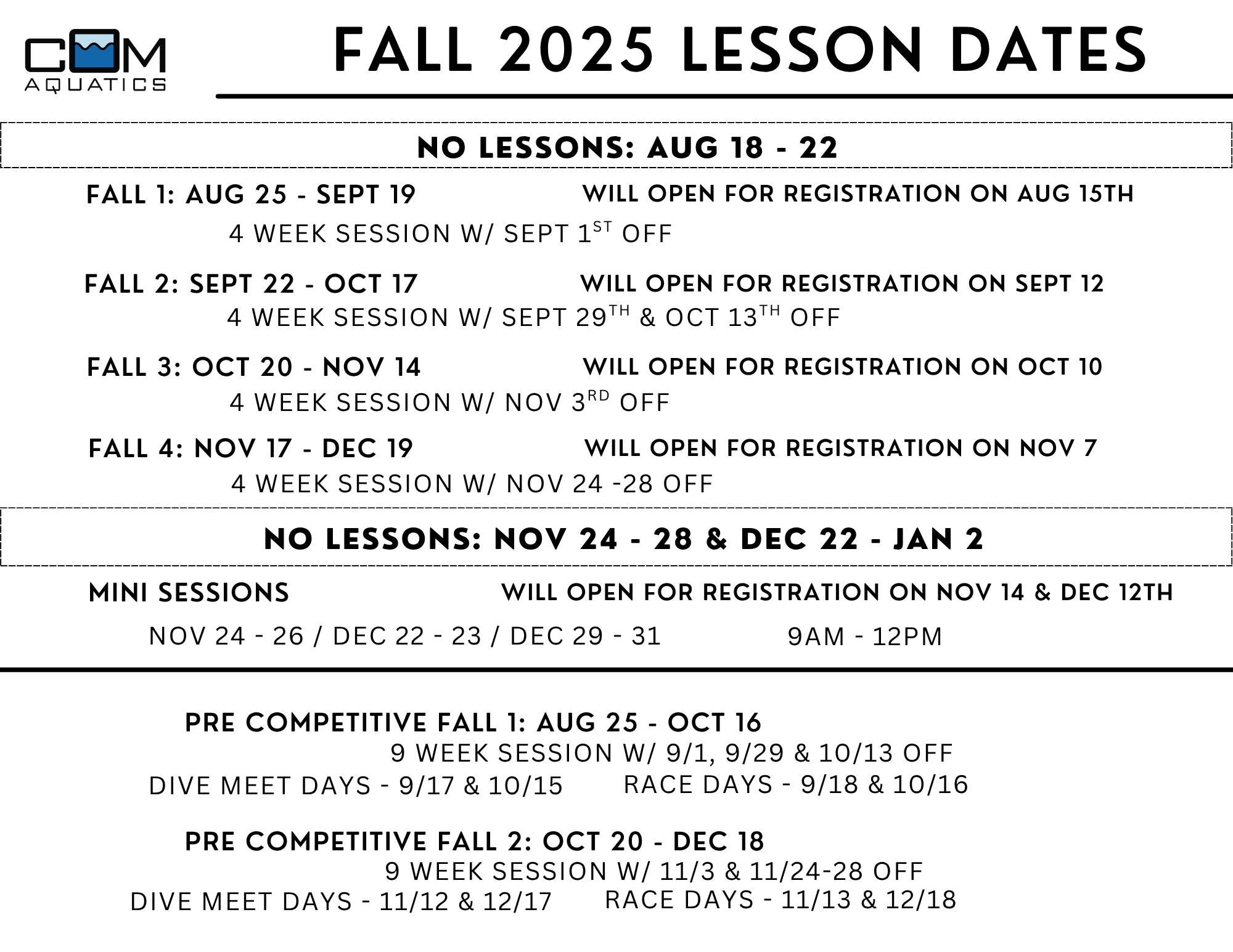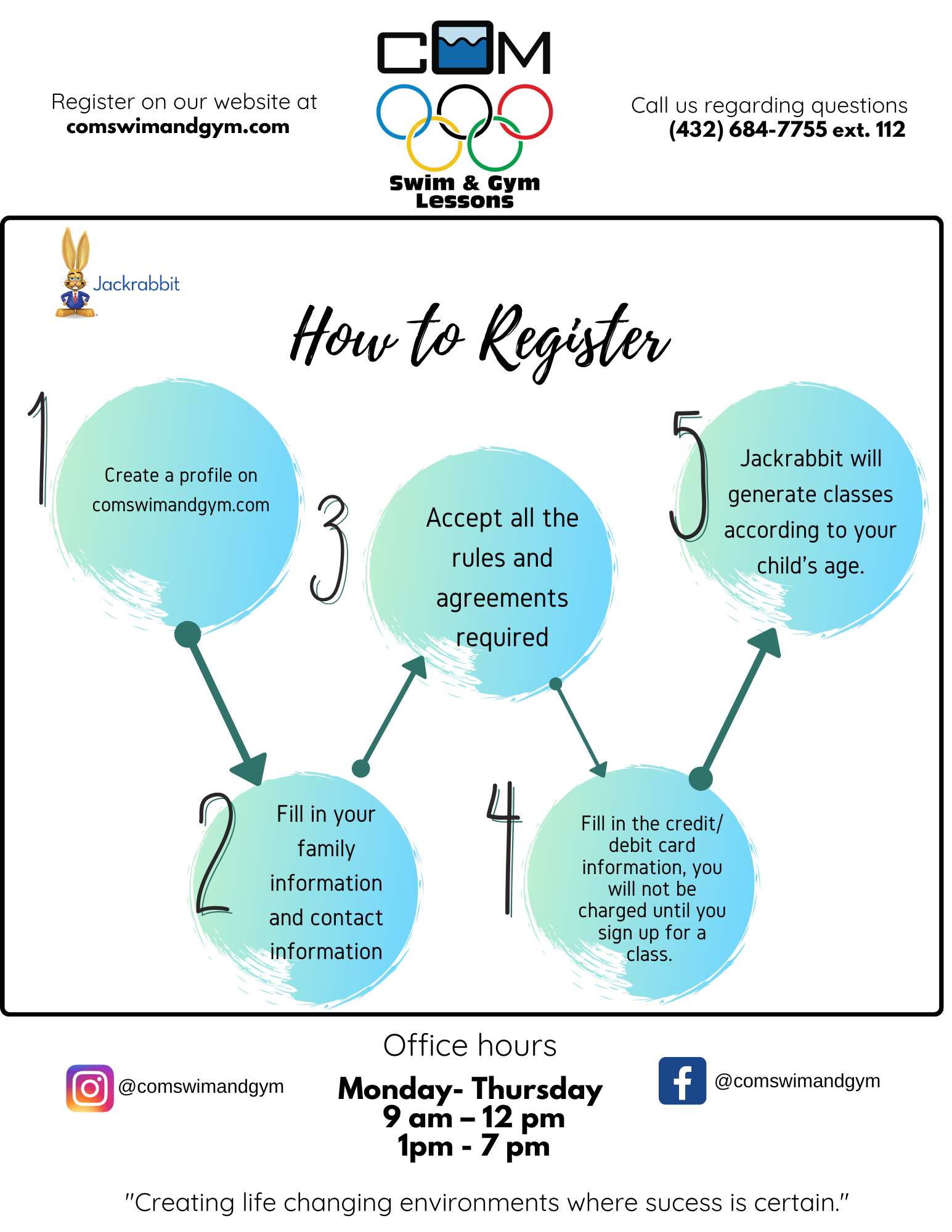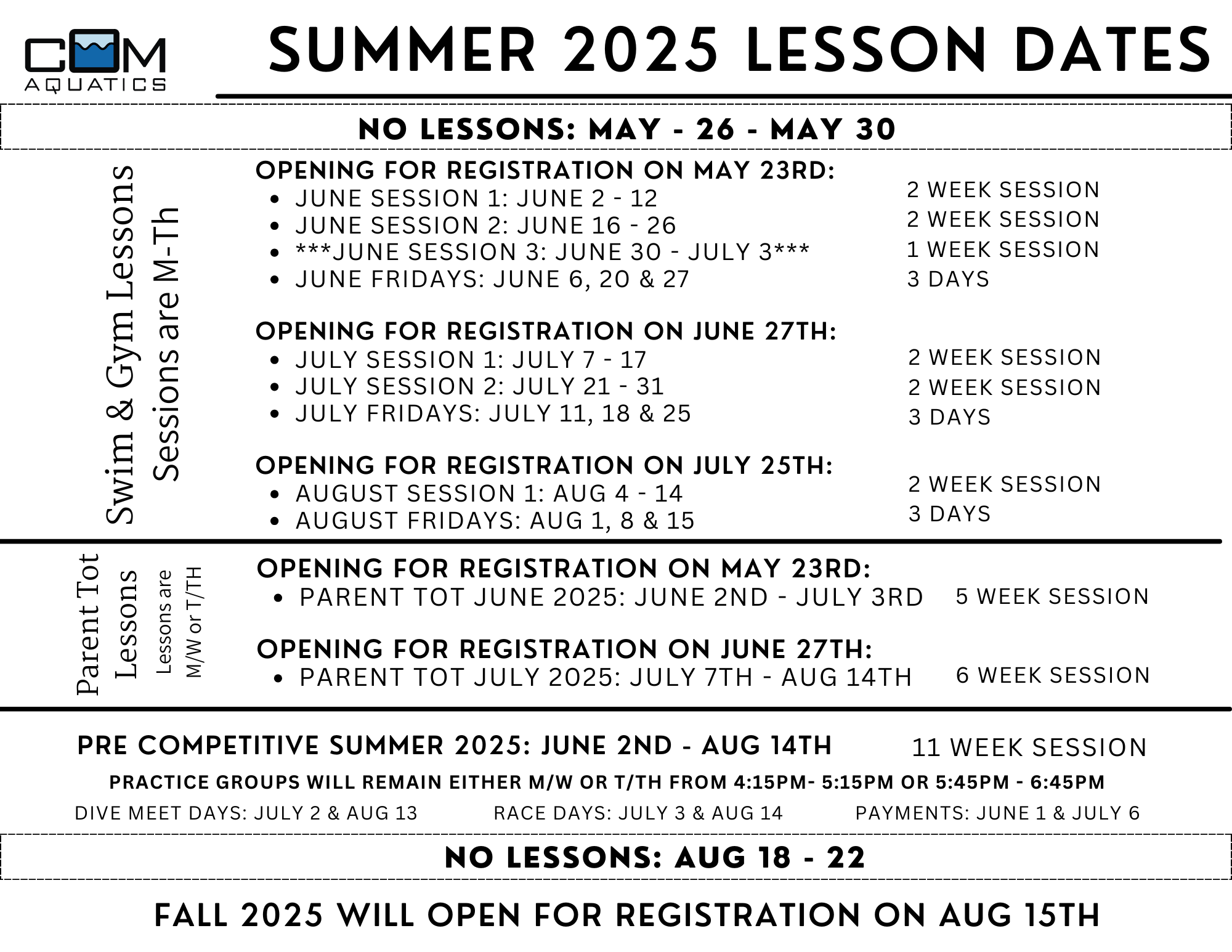 We have M-Th options, with the exception of Parent Tot and Pre COmpetitive which remain M/W or T/TH. Our first lessons beginning at 8:35 am and the last lesson beginning at 6:30 pm. Each lesson is 30 minutes long with a 5 minute break in between.