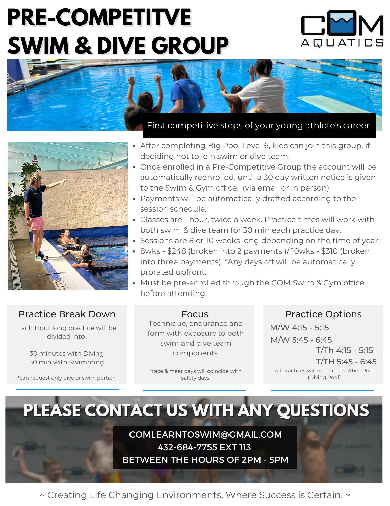 For those that meet the skill requirements this group will focus on building a competitive foundation and love for the sport of swimming and diving. This group is the first competitive step in your young athletes career.