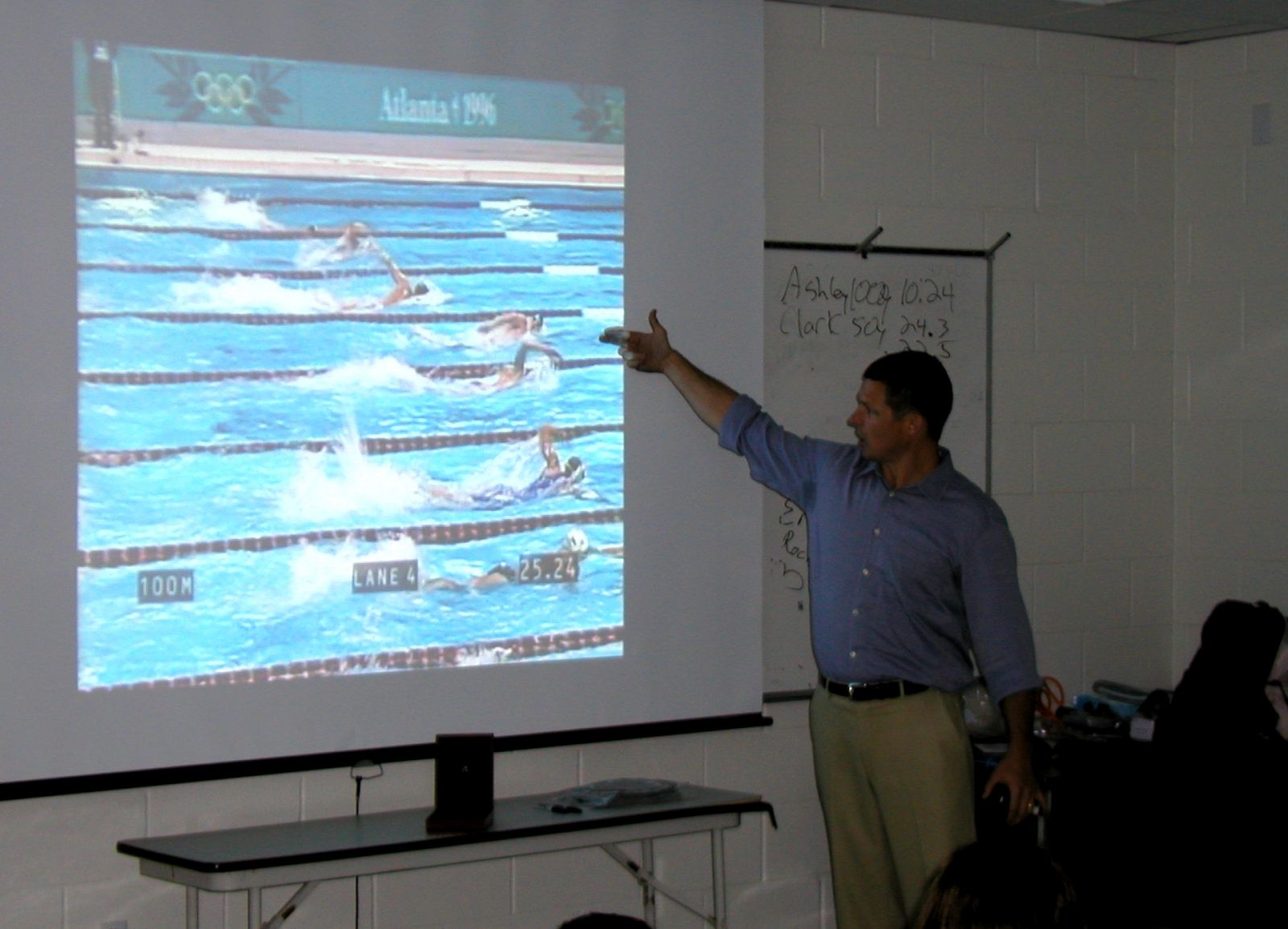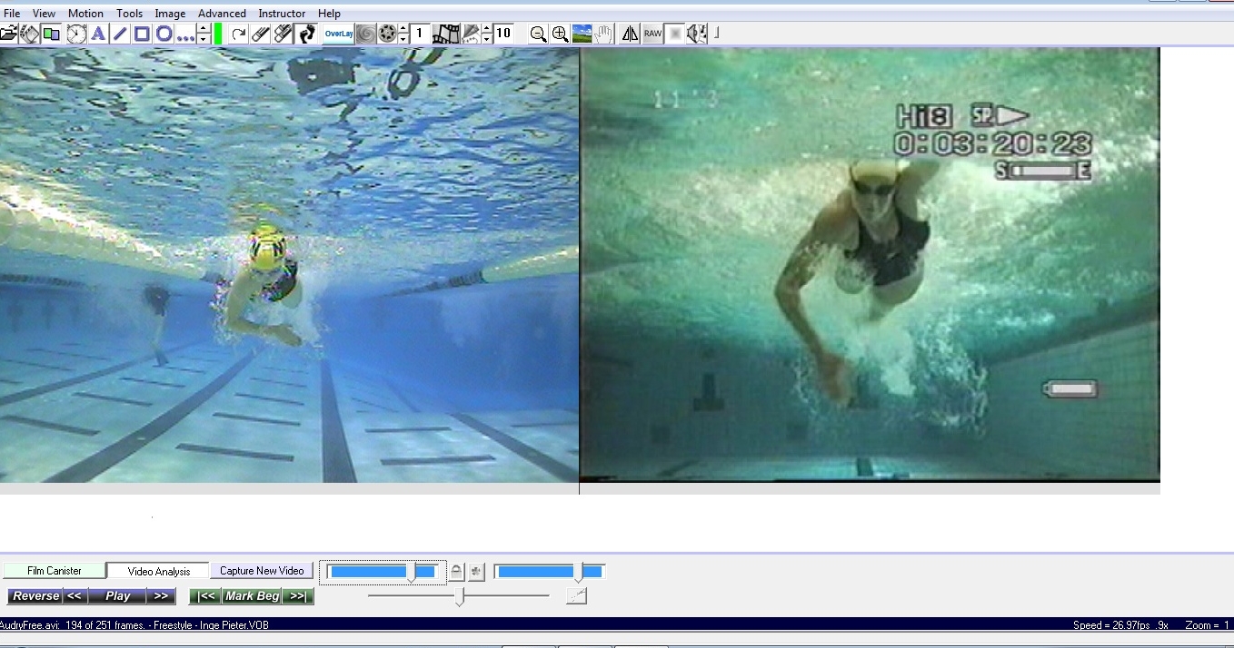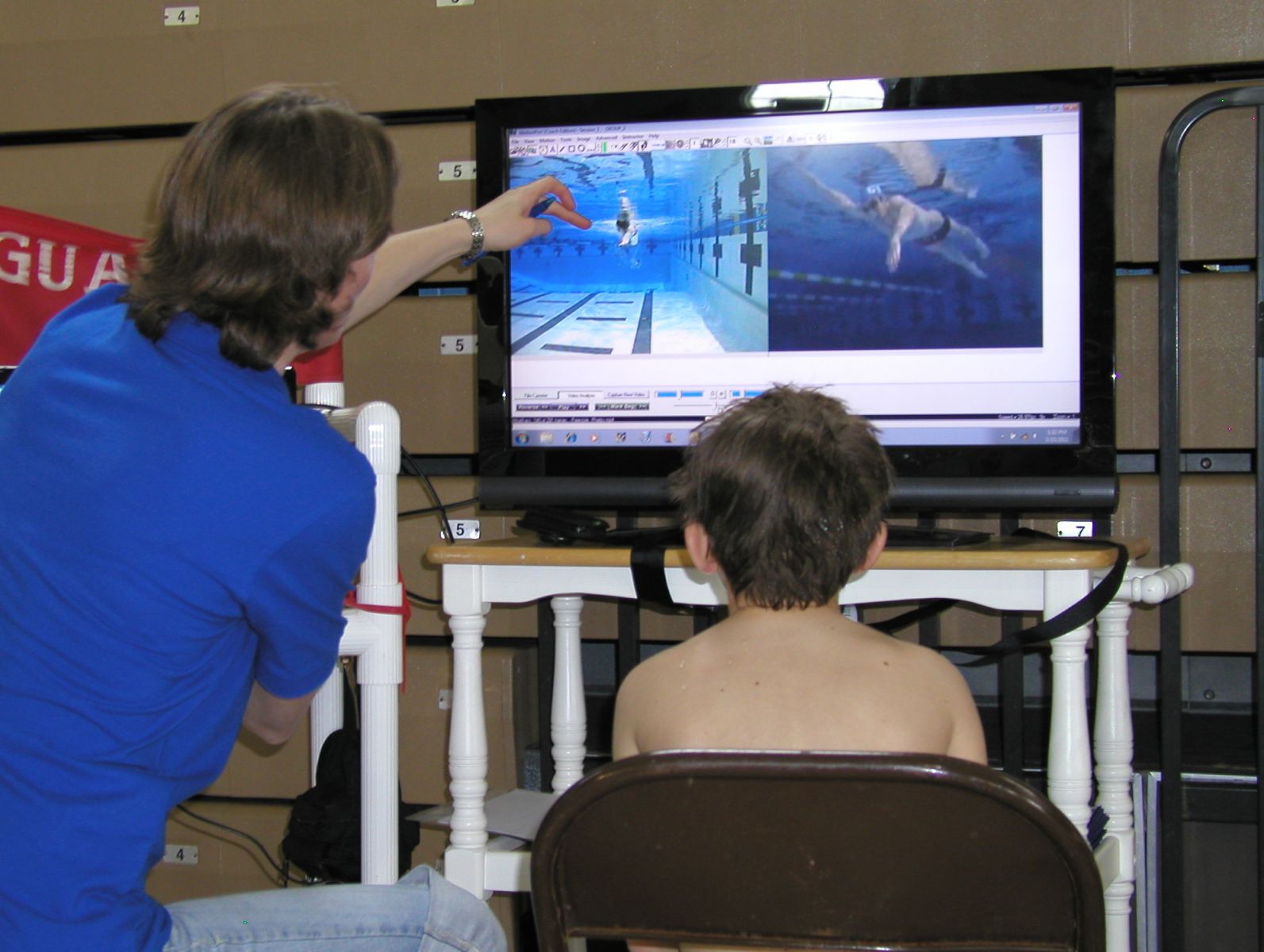 We use motion analysis software to capture underwater footage and to perform powerful video analysis of your swimmer's stroke technique. The software allows us to show your swimmer frame-by-frame what he/she does at each part of the stroke cycle. This program also allows us to view two videos simultaneously for side-by-side comparison of your swimmer and Olympic swimmers.