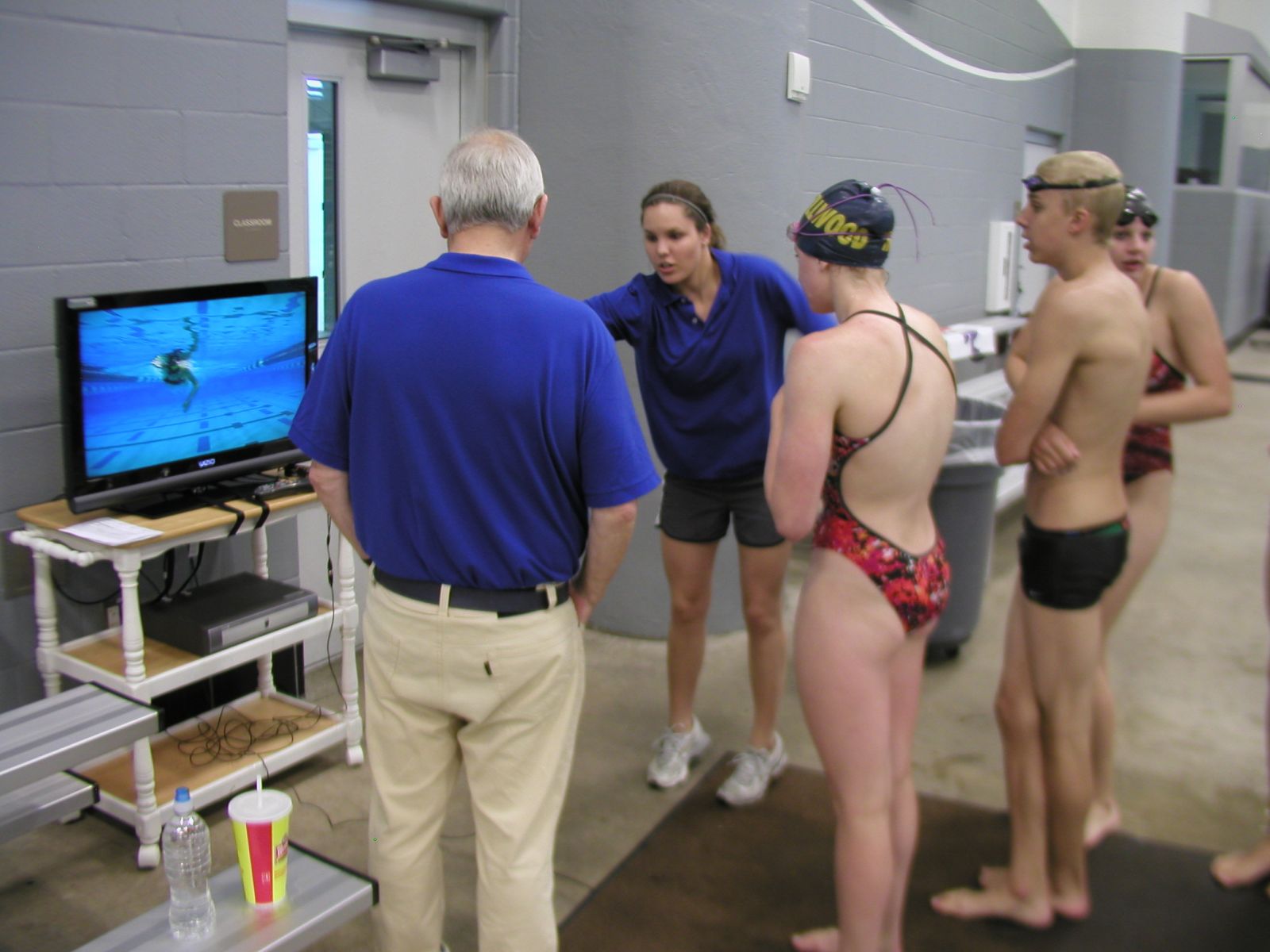 During several pool sessions, we set up cameras above or underwater and start non-stop recording with a viewing delay of less than a minute. That way, while the first swimmer climbs out of the pool to watch the swim skill he/she just performed, the second swimmer in line swims and gets recorded. Then that swimmer climbs out to watch his/her swim, while the third swimmer swims and gets recorded, and so on.