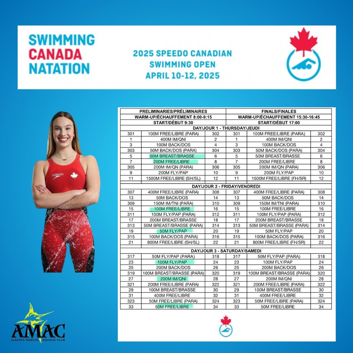 What a weekend it was at the Canadian Open this past weekend in Edmonton. We had some of Canada's biggest stars in the pool which made for some very fast prelim swims and very exciting finals! In order to make a second swim, you had to place in the top 20 of your events as it was an “open” age category which means you had to be right on your best times or go best times in the morning to see a second swim. Rowynn Biffart did just that all weekend long! Not only did she make second swims in 5/7 events, she got the chance to have a “swim-off” on her first day in the 200 free. During her first ever swim-off, Rowynn dropped 3 seconds from her PB in the morning with a 2:05 and won! This set the tone for the rest of the weekend where he had multiple second swims and was able to snag an “A” final swim in her 100 fly. Best times, club records and new qualifying times for Trials in June means that it was a very successful weekend for Rowynn and we as a club could not be happier for her accomplishments!