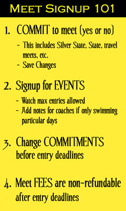 All swim meet entries are completed on-line through our team website. The coaching staff is always available to discuss what events swimmers should swim at meets, however, you and your swimmer are responsible for committing and signing up for events at meets.