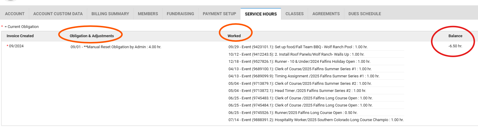 You can now see your service hours obligation set at the beginning of the season, the jobs you have worked, and your service sessions balance. A balance of 0 or a negative balance indicates that you have met your service sessions obligation. A positive balance displays the number of sessions remaining to meet your obligation.