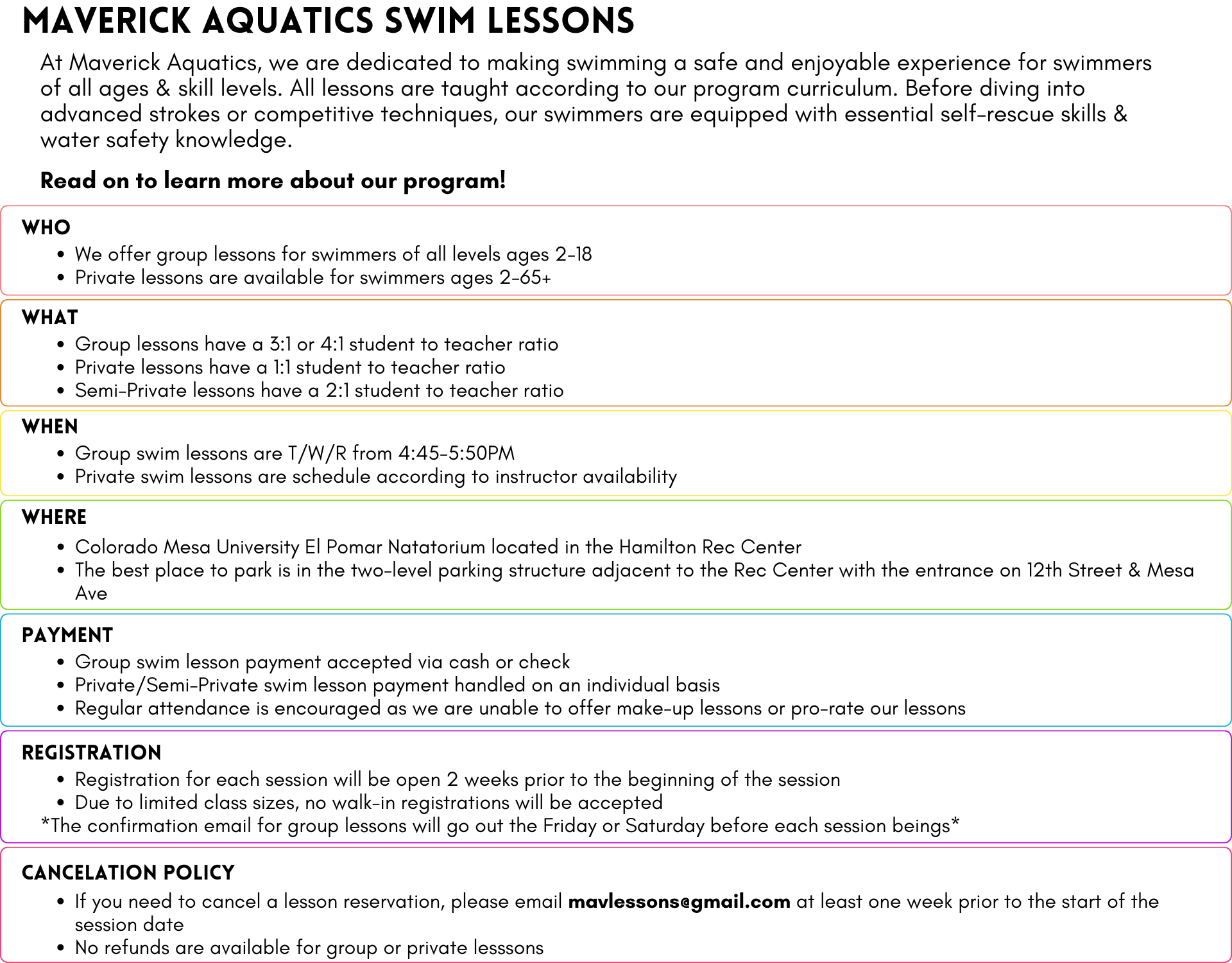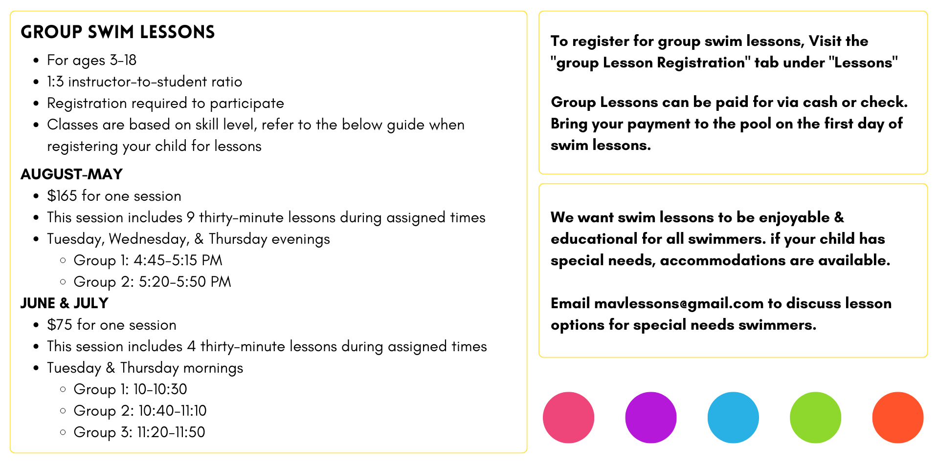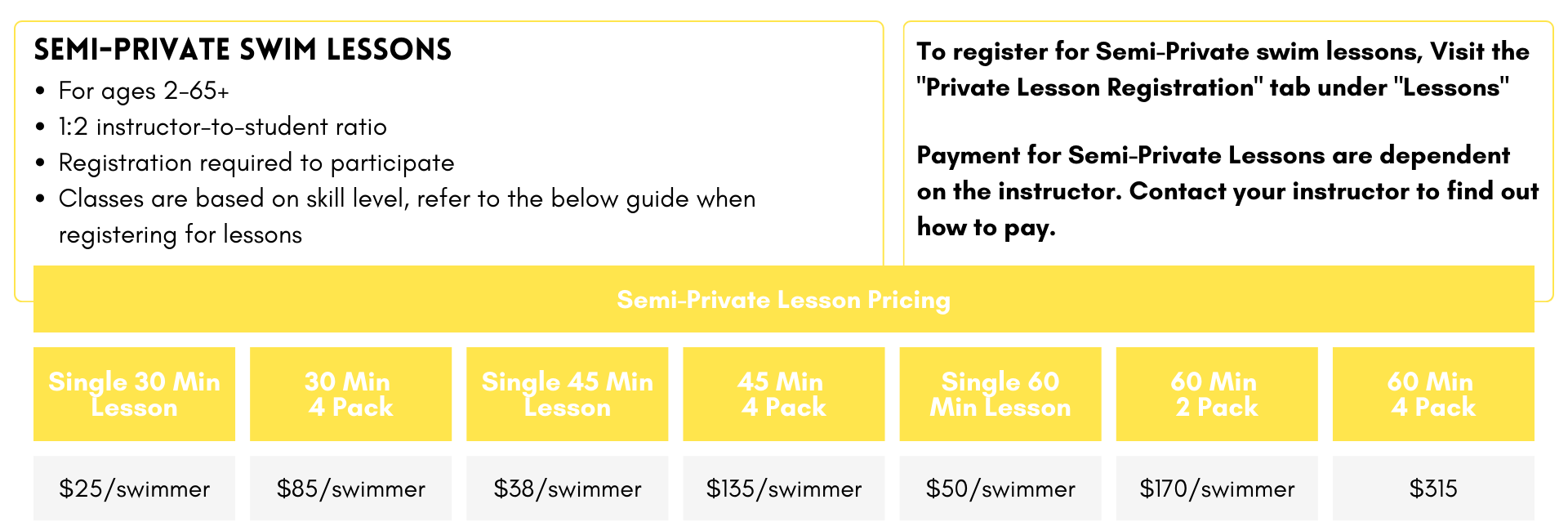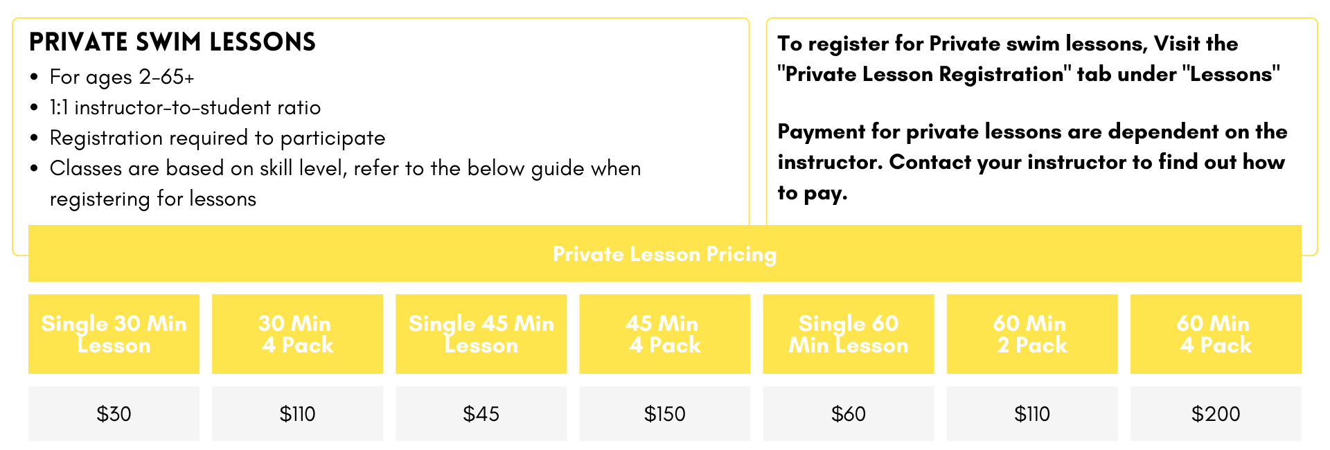 Visit the "Group Lesson Registration" tabs under "Lessons" to register for group and private lessons!