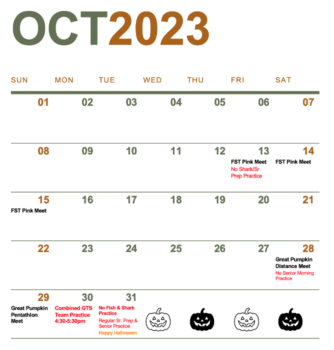 - October 28-29: Great Pumpkin Swim Meet